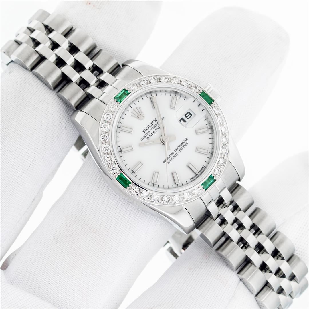 One Ladies Pre Owned Quickset Sapphire Stainless Steel Rolex Datejust Polished Bright with Satin Finish, Serviced & Electronically Tested, Rolex Stainless Steel Case: 26mm, Rolex Stainless Steel Crown, Custom Bezel: New 18K White Gold Diamond & Emerald Bezel, Stone Count: 28 Diamonds + 4 Emeralds. Crystal: Sapphire With Magnified Date Window. Hands: Luminescent Hands. Rolex Movement: Automatic Winding Movement 2235. Rolex Dial: White Index With Dash Track. Date Window: 3 O'Clock Position Date Display, Model: Quickset Datejust. Condition: G-6 Extra Fine. Rolex Bracelet: Stainless Steel Jubilee Band. Bright Polish & Satin Finish. 6.0 Inch Length, Adjustable. Hidden Clap, With Rolex Logo. This Watch Has Been Serviced Time Tested And Is In Excellent Condition It Is Free Of All Scratches And Dents.