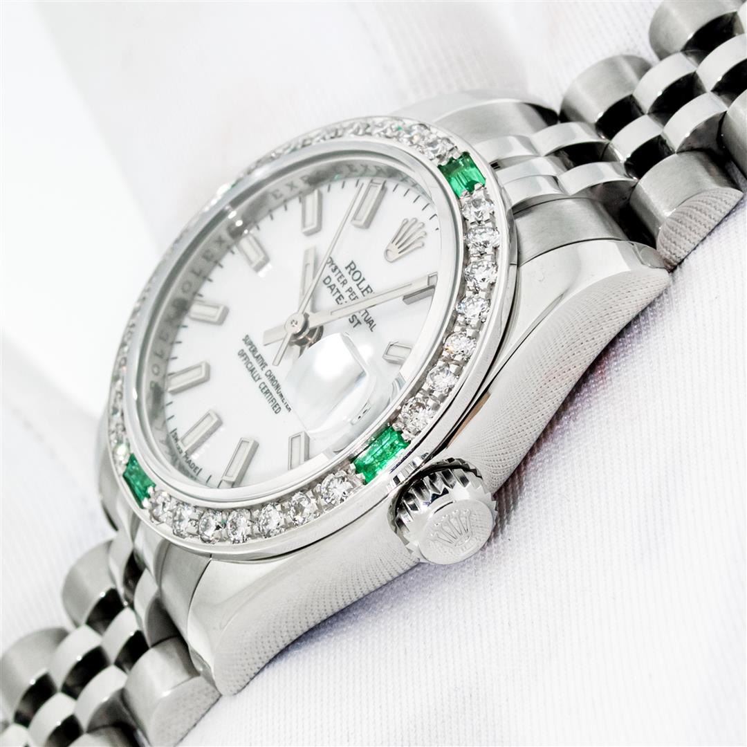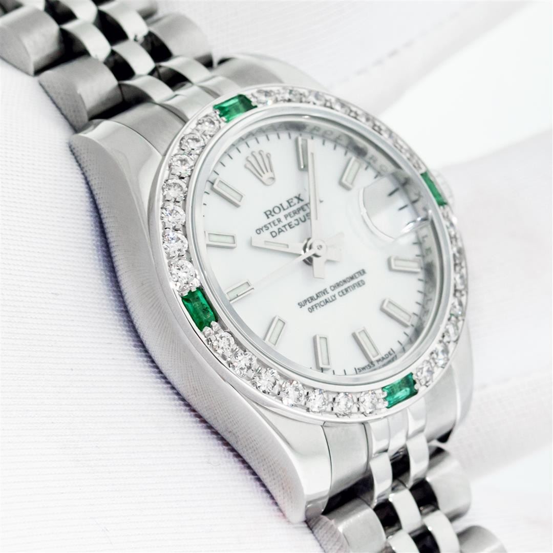 One Ladies Pre Owned Quickset Sapphire Stainless Steel Rolex Datejust Polished Bright with Satin Finish, Serviced & Electronically Tested, Rolex Stainless Steel Case: 26mm, Rolex Stainless Steel Crown, Custom Bezel: New 18K White Gold Diamond & Emerald Bezel, Stone Count: 28 Diamonds + 4 Emeralds. Crystal: Sapphire With Magnified Date Window. Hands: Luminescent Hands. Rolex Movement: Automatic Winding Movement 2235. Rolex Dial: White Index With Dash Track. Date Window: 3 O'Clock Position Date Display, Model: Quickset Datejust. Condition: G-6 Extra Fine. Rolex Bracelet: Stainless Steel Jubilee Band. Bright Polish & Satin Finish. 6.0 Inch Length, Adjustable. Hidden Clap, With Rolex Logo. This Watch Has Been Serviced Time Tested And Is In Excellent Condition It Is Free Of All Scratches And Dents.