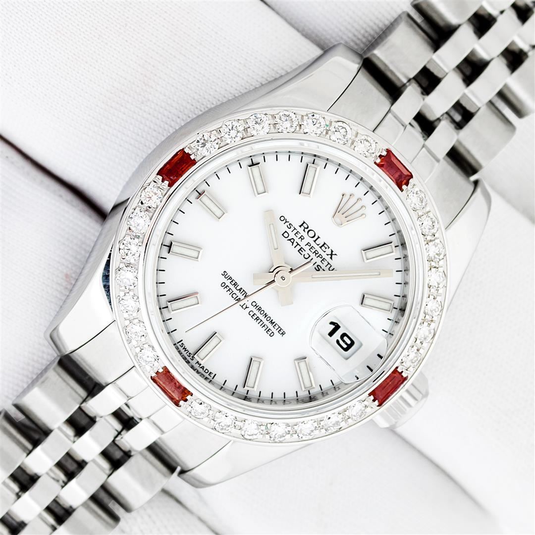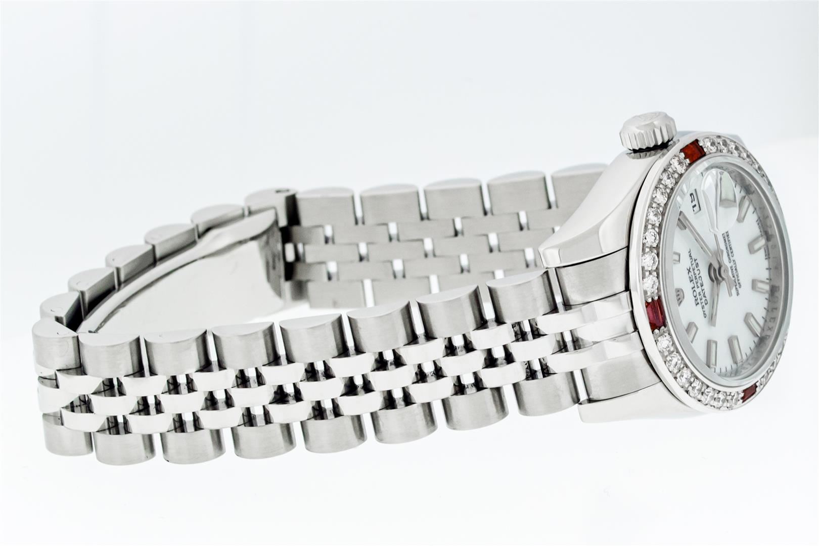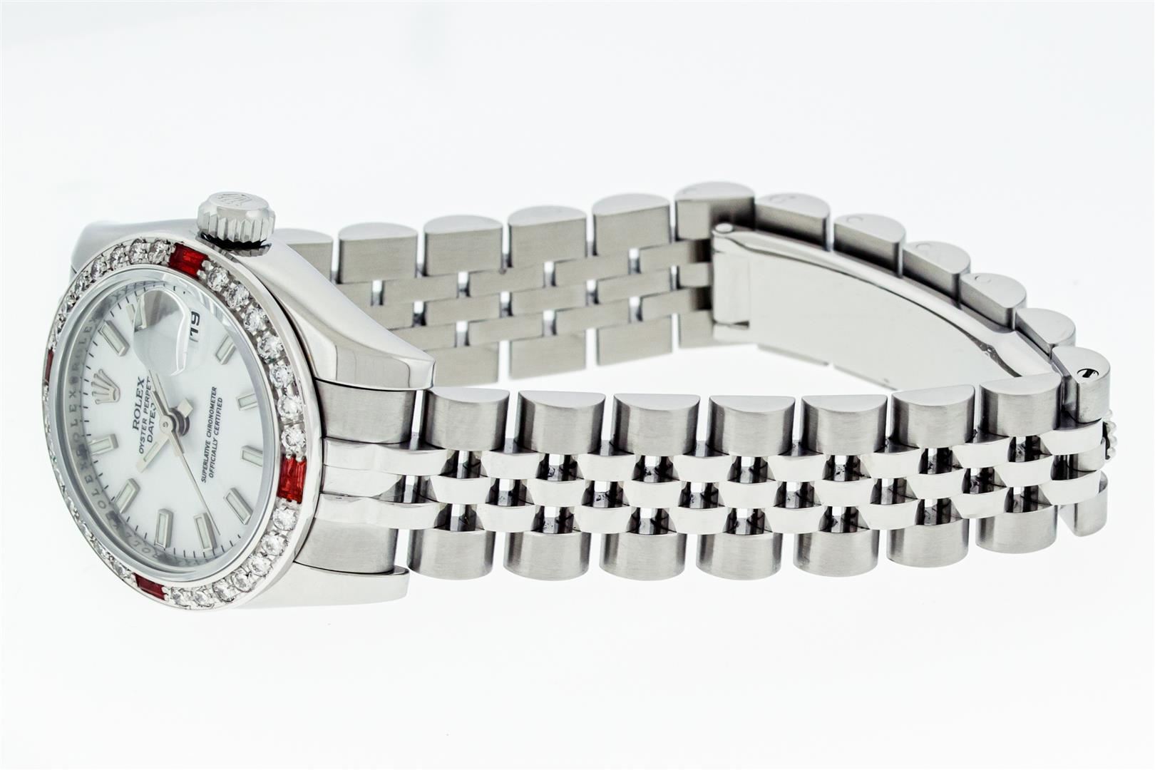 One Ladies Pre Owned Quickset Sapphire Stainless Steel Rolex Datejust Polished Bright with Satin Finish, Serviced & Electronically Tested, Rolex Stainless Steel Case: 26mm, Rolex Stainless Steel Crown, Custom Bezel: New 18K White Gold Diamond & Ruby Bezel, Stone Count: 28 Diamonds + 4 Rubies. Crystal: Sapphire With Magnified Date Window. Hands: Luminescent Hands. Rolex Movement: Automatic Winding Movement 2235. Rolex Dial: White Index With Dash Track. Date Window: 3 O'Clock Position Date Display, Model: Quickset Datejust. Condition: G-6 Extra Fine. Rolex Bracelet: Stainless Steel Jubilee Band. Bright Polish & Satin Finish. 6.0 Inch Length, Adjustable. Hidden Clap, With Rolex Logo. This Watch Has Been Serviced Time Tested And Is In Excellent Condition It Is Free Of All Scratches And Dents.
