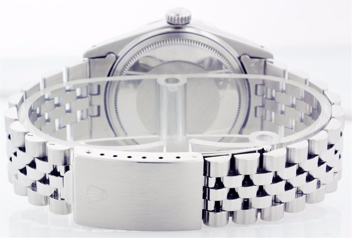 One Mens Rolex Datejust Polished Bright with Satin Finish, Serviced & Electronically Tested, Stainless Steel Case:36mm, Stainless Steel Crown, Custom Bezel: 18K White Gold Ruby Beadset Diamond Bezel, Diamond + Gem Count: 36 Diamonds + 4 Rubies Total Weight 1.00 Carat, Clarity: SI-VS, Color: G to H. Custom Crystal: Synthetic Sapphire Cyclops Lens. Movement: Automatic Winding Movement Caliber 3035. Custom Dial: Chocolate With Baguette Hour Markers, 8 Diamond Baguettes + 2 Ruby Baguettes in Dial, Dial Weight: .40 Carat, G To H In Color, Clarity: SI-VS. Date Window: 3 O'Clock Position Date Display, Quickset, Model: 16014 Condition: G-6 Extra Fine. Bracelet: Stainless Steel Jubilee. Bright Polish & Satin Finish. 6.5 Inch Length, Adjustable. Standard Clasp, With Rolex Logo.