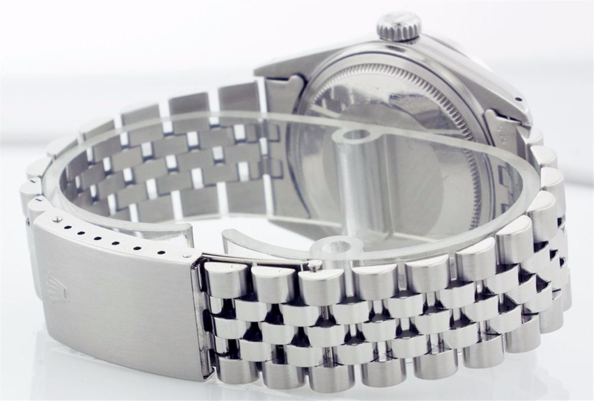 One Mens Rolex Datejust Polished Bright with Satin Finish, Serviced & Electronically Tested, Stainless Steel Case:36mm, Stainless Steel Crown, Custom Bezel: 18K White Gold Ruby Beadset Diamond Bezel, Diamond + Gem Count: 36 Diamonds + 4 Rubies Total Weight 1.00 Carat, Clarity: SI-VS, Color: G to H. Custom Crystal: Synthetic Sapphire Cyclops Lens. Movement: Automatic Winding Movement Caliber 3035. Custom Dial: Chocolate With Baguette Hour Markers, 8 Diamond Baguettes + 2 Ruby Baguettes in Dial, Dial Weight: .40 Carat, G To H In Color, Clarity: SI-VS. Date Window: 3 O'Clock Position Date Display, Quickset, Model: 16014 Condition: G-6 Extra Fine. Bracelet: Stainless Steel Jubilee. Bright Polish & Satin Finish. 6.5 Inch Length, Adjustable. Standard Clasp, With Rolex Logo.