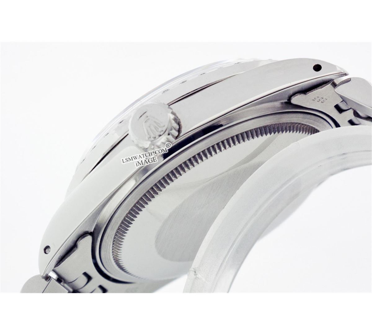 One Mens Rolex Datejust Polished Bright with Satin Finish, Serviced & Electronically Tested, Stainless Steel Case:36mm, Stainless Steel Crown, Custom Bezel: 18K White Gold Ruby Beadset Diamond Bezel, Diamond + Gem Count: 36 Diamonds + 4 Rubies Total Weight 1.00 Carat, Clarity: SI-VS, Color: G to H. Custom Crystal: Synthetic Sapphire Cyclops Lens. Movement: Automatic Winding Movement Caliber 3035. Custom Dial: Chocolate With Baguette Hour Markers, 8 Diamond Baguettes + 2 Ruby Baguettes in Dial, Dial Weight: .40 Carat, G To H In Color, Clarity: SI-VS. Date Window: 3 O'Clock Position Date Display, Quickset, Model: 16014 Condition: G-6 Extra Fine. Bracelet: Stainless Steel Jubilee. Bright Polish & Satin Finish. 6.5 Inch Length, Adjustable. Standard Clasp, With Rolex Logo.