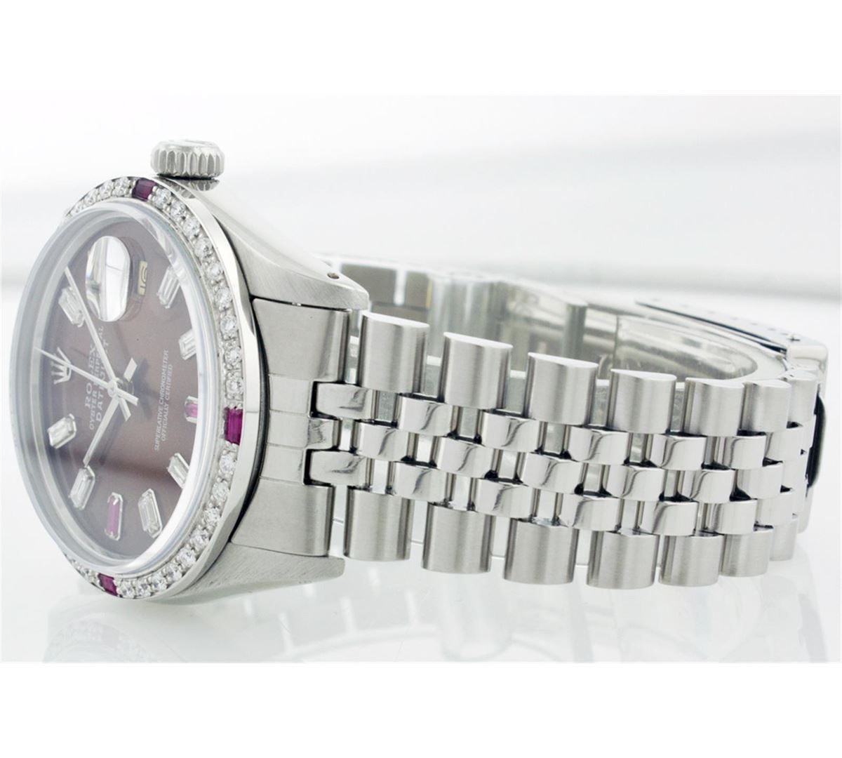 One Mens Rolex Datejust Polished Bright with Satin Finish, Serviced & Electronically Tested, Stainless Steel Case:36mm, Stainless Steel Crown, Custom Bezel: 18K White Gold Ruby Beadset Diamond Bezel, Diamond + Gem Count: 36 Diamonds + 4 Rubies Total Weight 1.00 Carat, Clarity: SI-VS, Color: G to H. Custom Crystal: Synthetic Sapphire Cyclops Lens. Movement: Automatic Winding Movement Caliber 3035. Custom Dial: Chocolate With Baguette Hour Markers, 8 Diamond Baguettes + 2 Ruby Baguettes in Dial, Dial Weight: .40 Carat, G To H In Color, Clarity: SI-VS. Date Window: 3 O'Clock Position Date Display, Quickset, Model: 16014 Condition: G-6 Extra Fine. Bracelet: Stainless Steel Jubilee. Bright Polish & Satin Finish. 6.5 Inch Length, Adjustable. Standard Clasp, With Rolex Logo.