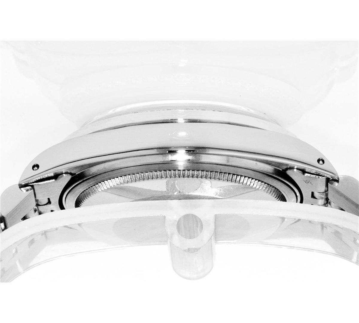 One Mens Rolex Datejust Polished Bright with Satin Finish, Serviced & Electronically Tested, Stainless Steel Case:36mm, Stainless Steel Crown, Custom Bezel: 18K White Gold Ruby Beadset Diamond Bezel, Diamond + Gem Count: 36 Diamonds + 4 Rubies Total Weight 1.00 Carat, Clarity: SI-VS, Color: G to H. Custom Crystal: Synthetic Sapphire Cyclops Lens. Movement: Automatic Winding Movement Caliber 3035. Custom Dial: Chocolate With Baguette Hour Markers, 8 Diamond Baguettes + 2 Ruby Baguettes in Dial, Dial Weight: .40 Carat, G To H In Color, Clarity: SI-VS. Date Window: 3 O'Clock Position Date Display, Quickset, Model: 16014 Condition: G-6 Extra Fine. Bracelet: Stainless Steel Jubilee. Bright Polish & Satin Finish. 6.5 Inch Length, Adjustable. Standard Clasp, With Rolex Logo.