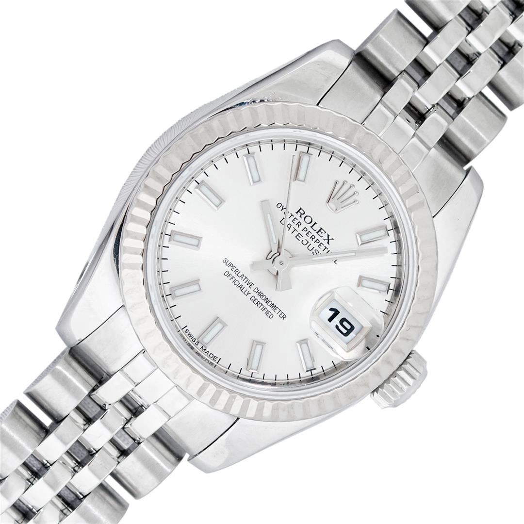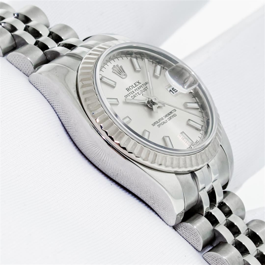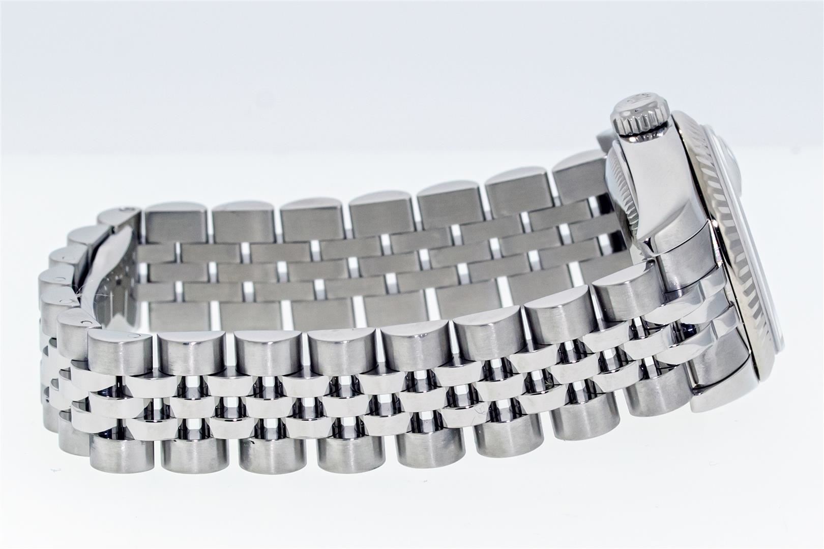 One Ladies Pre Owned Quickset Sapphire Stainless Steel Rolex Datejust Polished Bright with Satin Finish, Serviced & Electronically Tested, Rolex Stainless Steel Case: 26mm, Rolex Stainless Steel Crown, Rolex Bezel: 18K White Gold Fluted Bezel. Crystal: Sapphire With Magnified Date Window. Hands: Luminescent Hands. Rolex Movement: Automatic Winding Movement 2235. Rolex Dial: Silver Index With Dash Track. Date Window: 3 O'Clock Position Date Display, Model: Sapphire Quickset Datejust. Condition: G-6 Extra Fine. Rolex Bracelet: Stainless Steel Jubilee Band. Bright Polish & Satin Finish. 6.0 Inch Length, Adjustable. Hidden Clap, With Rolex Logo. This Watch Has Been Serviced Time Tested And Is In Excellent Condition It Is Free Of All Scratches And Dents.
