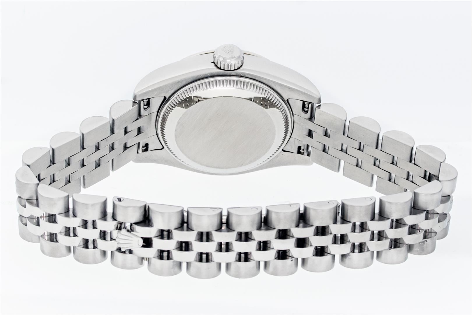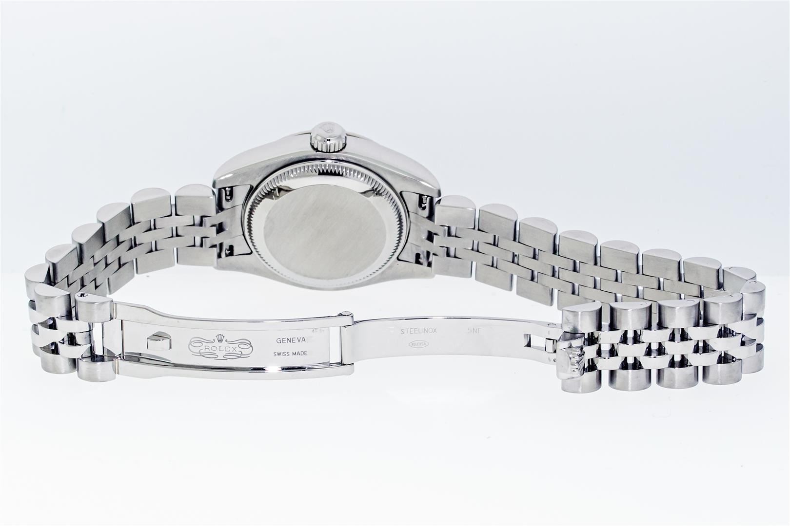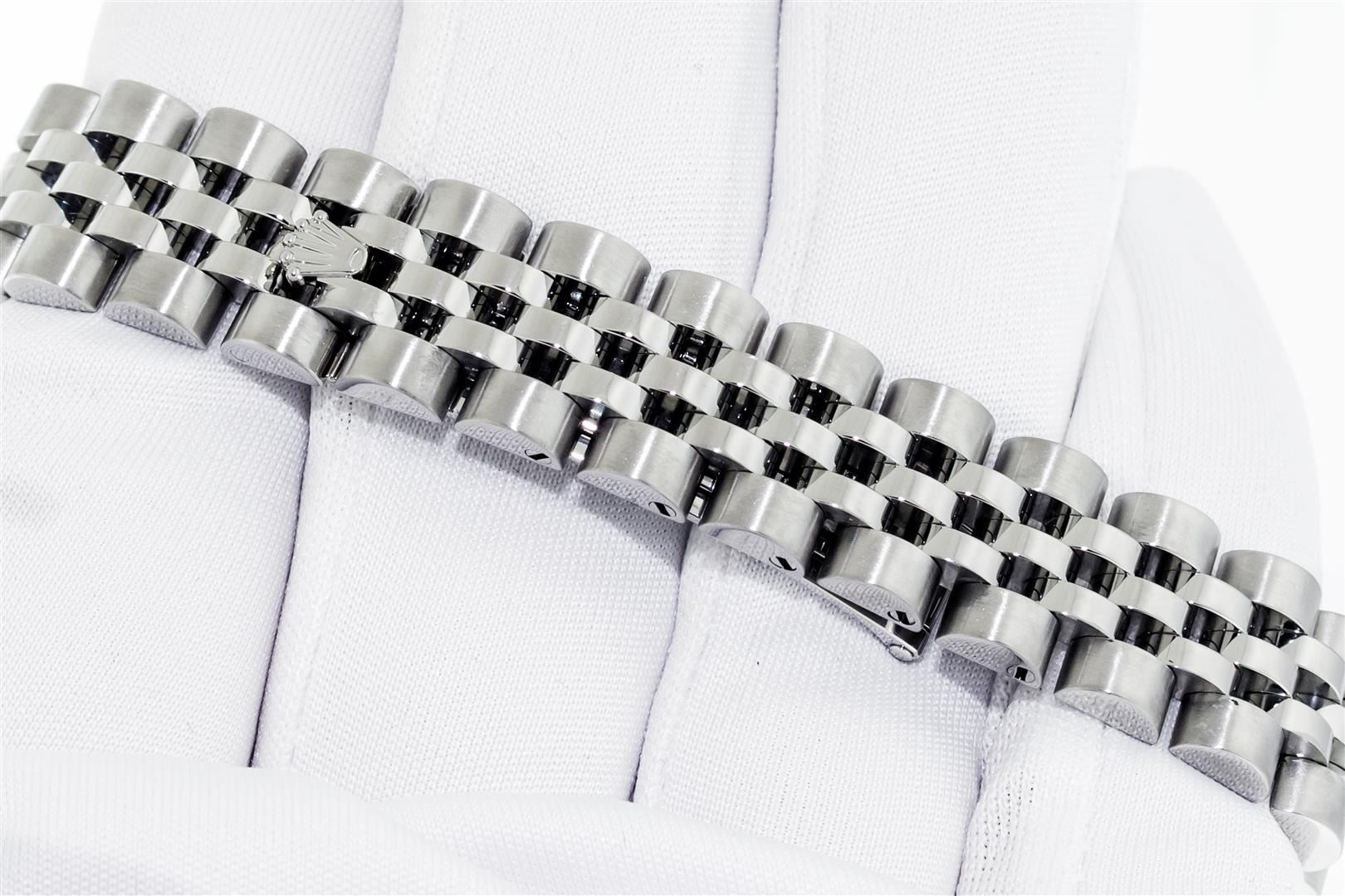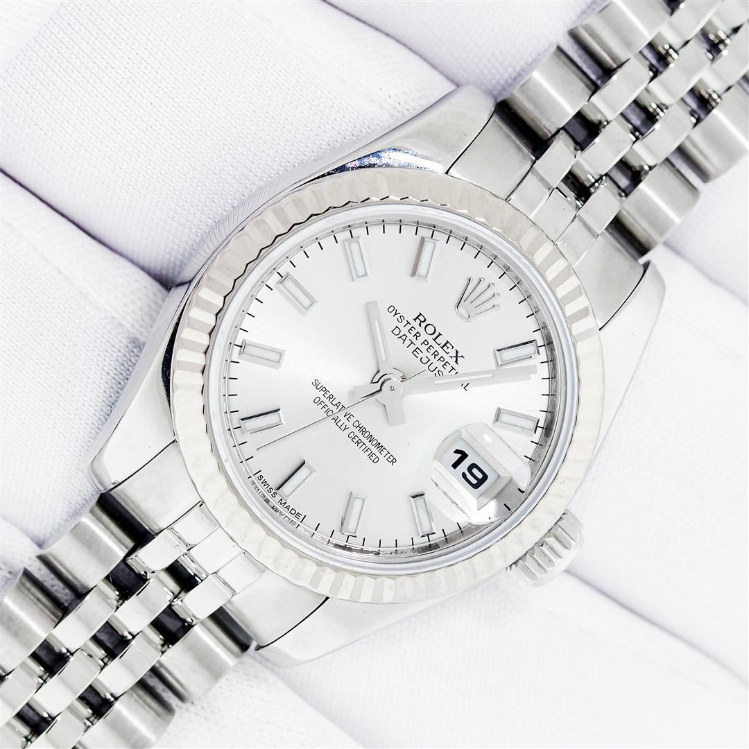 One Ladies Pre Owned Quickset Sapphire Stainless Steel Rolex Datejust Polished Bright with Satin Finish, Serviced & Electronically Tested, Rolex Stainless Steel Case: 26mm, Rolex Stainless Steel Crown, Rolex Bezel: 18K White Gold Fluted Bezel. Crystal: Sapphire With Magnified Date Window. Hands: Luminescent Hands. Rolex Movement: Automatic Winding Movement 2235. Rolex Dial: Silver Index With Dash Track. Date Window: 3 O'Clock Position Date Display, Model: Sapphire Quickset Datejust. Condition: G-6 Extra Fine. Rolex Bracelet: Stainless Steel Jubilee Band. Bright Polish & Satin Finish. 6.0 Inch Length, Adjustable. Hidden Clap, With Rolex Logo. This Watch Has Been Serviced Time Tested And Is In Excellent Condition It Is Free Of All Scratches And Dents.
