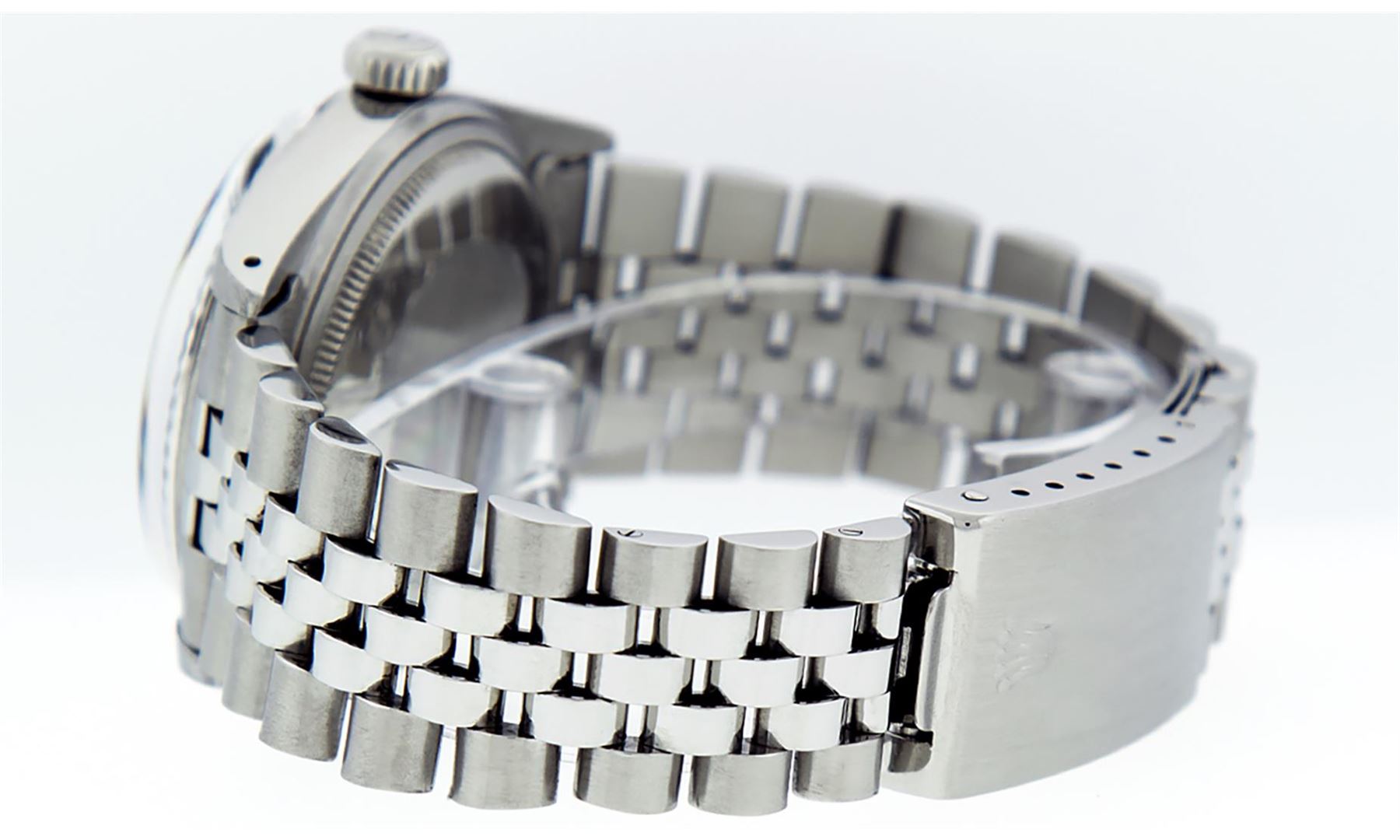 One Pre Owned Stainless Steel Rolex 36MM Datejust Polished Bright with Satin Finish, This Watch Has Been Serviced & Electronically Tested, Stainless Steel Case: 36mm, Stainless Steel Crown, Rolex Bezel: White Gold Fluted Bezel. Custom Crystal: New Plexiglass With Magnified Date Window. Custom Hands: New Luminescent Hands. Rolex Movement: Automatic Winding Movement 3035. Custom Dial: Custom Slate Grey Dial With Added Diamond Hour Markers, Diamond Count: 10 Diamonds in Dial. Date Window: 3 O'Clock Position Date Display, Quickset, Model: Datejust, Condition: G-6 Extra Fine. Rolex Bracelet: Stainless Steel Jubilee Band. Bright Polish & Satin Finish. 7.0 Inch Length, Adjustable. Fold Clasp, With Rolex Logo. This Watch Has Been Serviced Time Tested And Is In Excellent Condition It Is Free Of All Scratches And Dents.