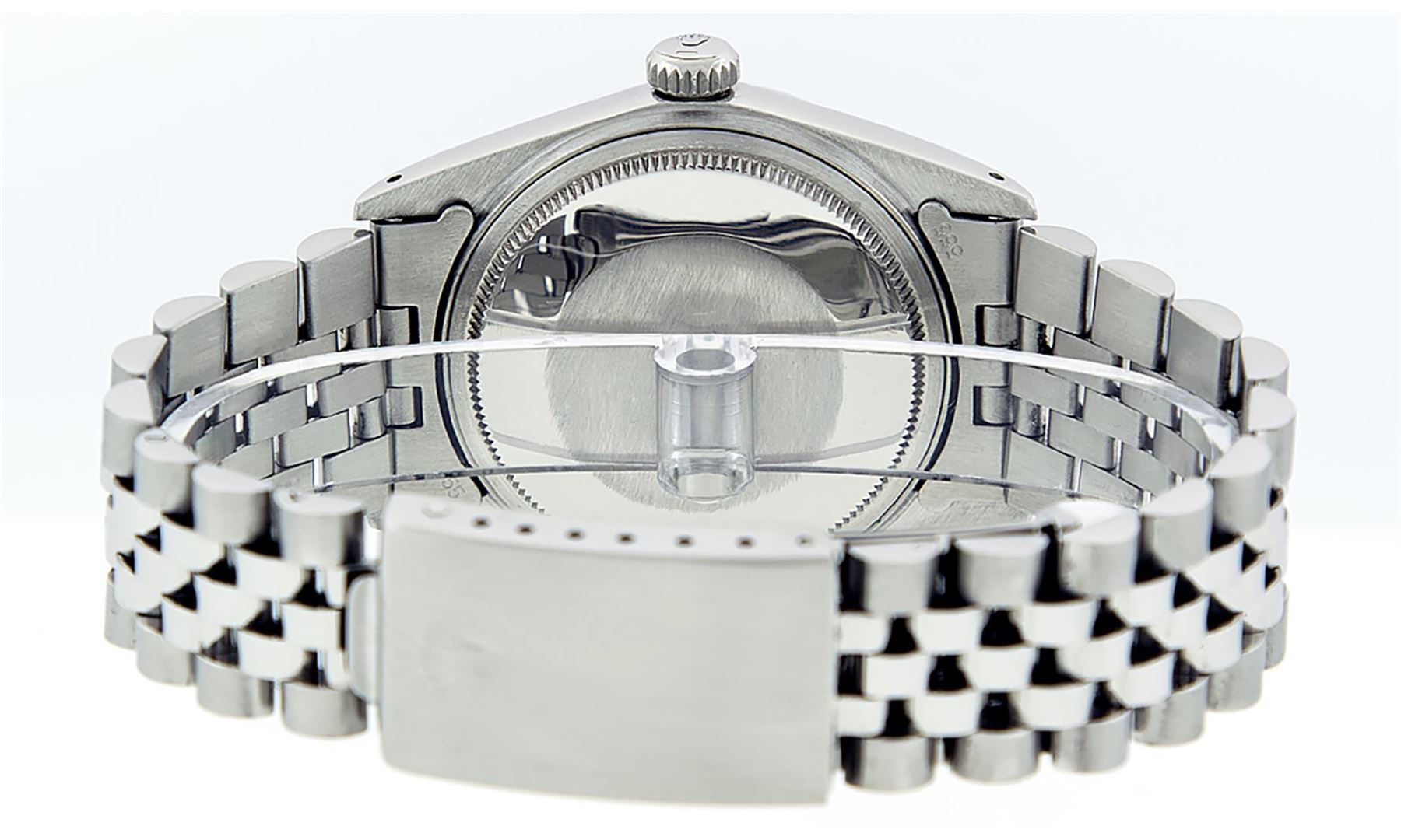 One Stainless Steel Rolex Datejust Polished Bright with Satin Finish, This Watch Has Been Serviced & Electronically Tested, Stainless Steel Case: 36mm, Stainless Steel Crown, Bezel: 14K White Gold Fluted Bezel. Custom Crystal: New Acrylic Cyclops Lens. Custom Hands: New Luminescent Hands. Movement: Automatic Winding Movement. Custom Dial: Slate Grey Diamond Dial With Diamond Hour Markers And Roman Track, Diamond Count: 10 Diamonds in Dial G To H In Color, SI-VS Clarity. Date Window: 3 O'Clock Position Date Display, Quickset, Model: Datejust, Condition: G-6 Extra Fine. Bracelet: Stainless Steel Jubilee. Bright Polish & Satin Finish. 7.0 Inch Length, Adjustable. Standard Clasp, With Rolex Logo. This Watch Has Been Serviced Time Tested And Is In Excellent Condition It Is Free Of All Scratches And Dents.