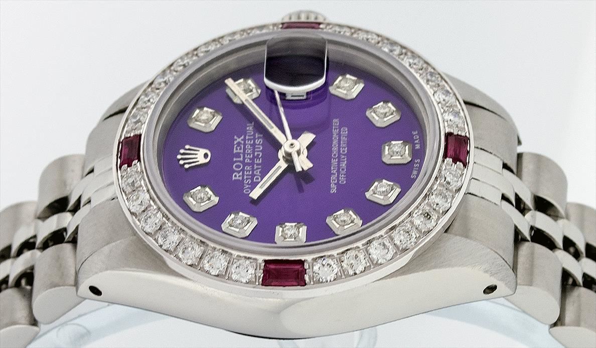 One Ladies Rolex Datejust Polished Bright with Satin Finish, Serviced & Electronically Tested, Stainless Steel Case:26mm, Stainless Steel Crown, Custom Bezel: 18K White Gold Ruby Beadset Diamond Bezel, Diamond Count: 28 Diamonds + 4 Rubies Total Weight .70 Carat, Clarity: SI-VS, Color: G to H. Custom Crystal: Synthetic Sapphire Cyclops Lens. Movement: Automatic Winding Movement Caliber 2030. Custom Dial: Purple Dial with Diamond Hour Markers. Diamond Count: 10 Diamonds In Dial, Clarity: SI-VS, Color: G to H. Date Window: 3 O'Clock Position Date Display, Model: Datejust. Condition: G-6 Extra Fine. Bracelet: Stainless Steel Jubilee Band. Bright Polish & Satin Finish. 6.0 Inch Length, Adjustable. Standard Clasp, With Rolex Logo.