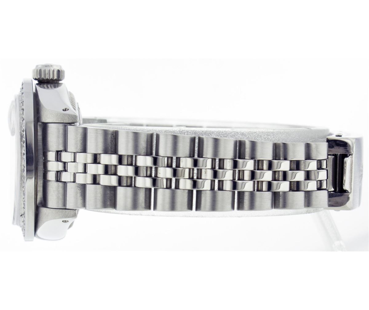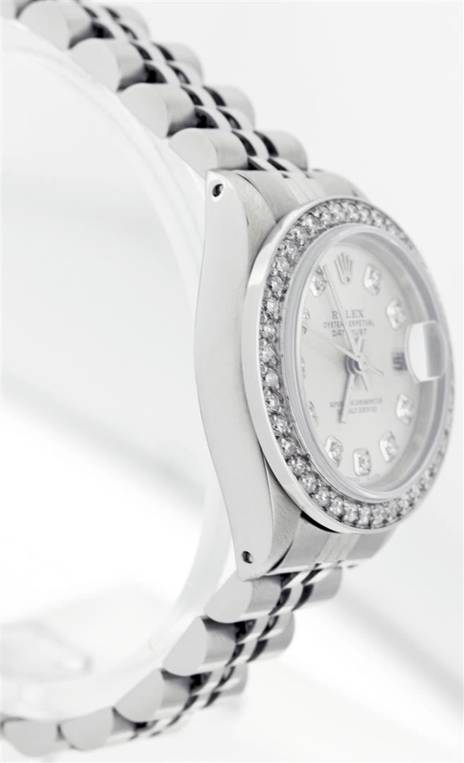 One Ladies Rolex Datejust Polished Bright with Satin Finish, Serviced & Electronically Tested, Stainless Steel Case:26mm, Stainless Steel Crown, Clarity: SI-VS, Color: G to H. Custom Bezel: Stainless Steel Beadset Diamond Bezel, Diamond Count: 40 Diamonds Total Weight 1.00 Carat, Clarity: SI-VS, Color: G to H. Custom Crystal: Synthetic Sapphire Cyclops Lens. Movement: Automatic Winding Movement Caliber 2030. Original Custom Dial: Refinished Silver With Diamond Dial, 10 Diamond in Dial G To H In Color, Clarity: SI-VS. Date Window: 3 O'Clock Position Date Display, Quickset, Model: 6917 Condition: G-6 Extra Fine. Bracelet: Stainless Steel Jubilee. Bright Polish & Satin Finish. 5.5 Inch Length, Adjustable. Standard Clasp, With Rolex Logo.
