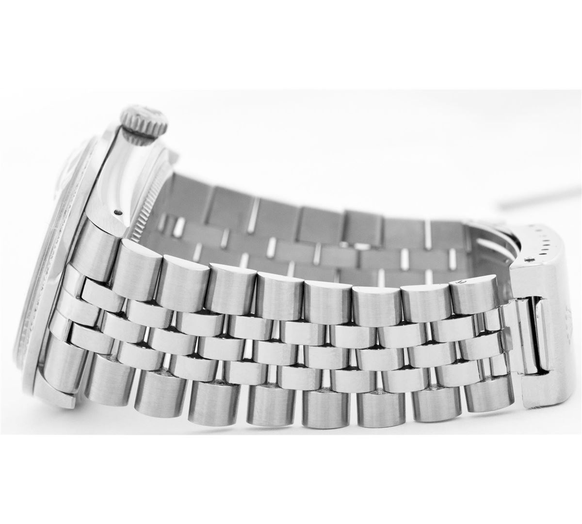 One Gents Rolex Datejust Polished, Serviced & Electronically Tested, Stainless Steel Case:36mm, Stainless Steel Crown, Custom Bezel: Stainless Steel Beadset Diamond Bezel, Diamond Count: 54 Diamonds, Total Weight 1.00 Carat, Clarity: SI-VS, Color: G to H. Custom Crystal: Synthetic Sapphire Cyclops Lens. Movement: Automatic Winding Movement Caliber 3035. Custom Dial: Silver String Diamond Dial, Diamond Count: 54 Diamonds In Dial, Clarity: SI-VS, Color: G to H. Date Window: 3 O'Clock Position Date Display, Quickset, Model: 16014 Condition: G-6 Extra Fine. Bracelet: Stainless Steel Jubilee. Bright Polish & Satin Finish. 6.5 Inch Length, Adjustable. Standard Clasp, With Rolex Logo.