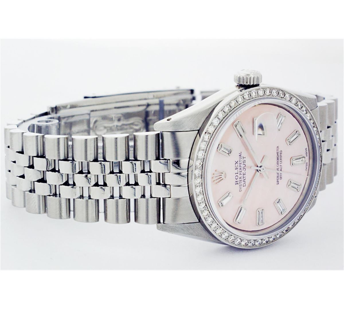 One Gents Rolex Datejust Polished, Serviced & Electronically Tested, Stainless Steel Case:36mm, Stainless Steel Crown, Custom Bezel: Stainless Steel Beadset Diamond Bezel, Diamond Count: 54 Diamonds, Total Weight 1.00 Carat, Clarity: SI-VS, Color: G to H. Custom Crystal: Synthetic Sapphire Cyclops Lens. Movement: Automatic Winding Movement Caliber 3035. Custom Dial: Pink Mother Of Pearl Baguette Diamond Dial, Diamond Count: 10 Baguette Diamonds Dial, Clarity: SI-VS, Color: G to H. Date Window: 3 O'Clock Position Date Display, Quickset, Model: 16014 Condition: G-6 Extra Fine. Bracelet: Stainless Steel Jubilee. Bright Polish & Satin Finish. 6.5 Inch Length, Adjustable. Standard Clasp, With Rolex Logo.