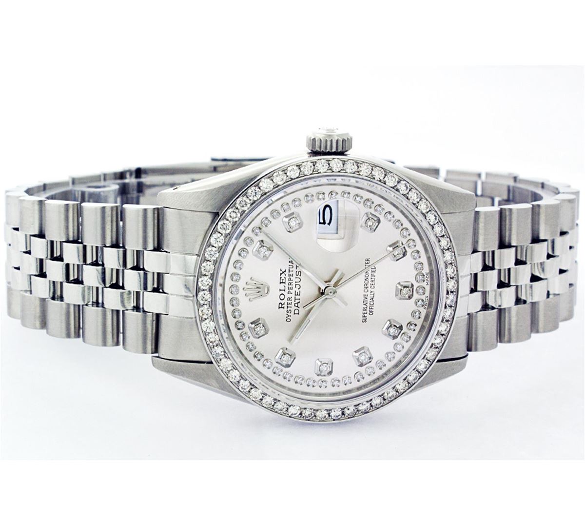 One Gents Rolex Datejust Polished, Serviced & Electronically Tested, Stainless Steel Case:36mm, Stainless Steel Crown, Custom Bezel: Stainless Steel Beadset Diamond Bezel, Diamond Count: 54 Diamonds, Total Weight 1.00 Carat, Clarity: SI-VS, Color: G to H. Custom Crystal: Synthetic Sapphire Cyclops Lens. Movement: Automatic Winding Movement Caliber 3035. Custom Dial: Silver String Diamond Dial, Diamond Count: 54 Diamonds In Dial, Clarity: SI-VS, Color: G to H. Date Window: 3 O'Clock Position Date Display, Quickset, Model: Datejust Condition: G-6 Extra Fine. Bracelet: Stainless Steel Jubilee. Bright Polish & Satin Finish. 6.5 Inch Length, Adjustable. Standard Clasp, With Rolex Logo.
