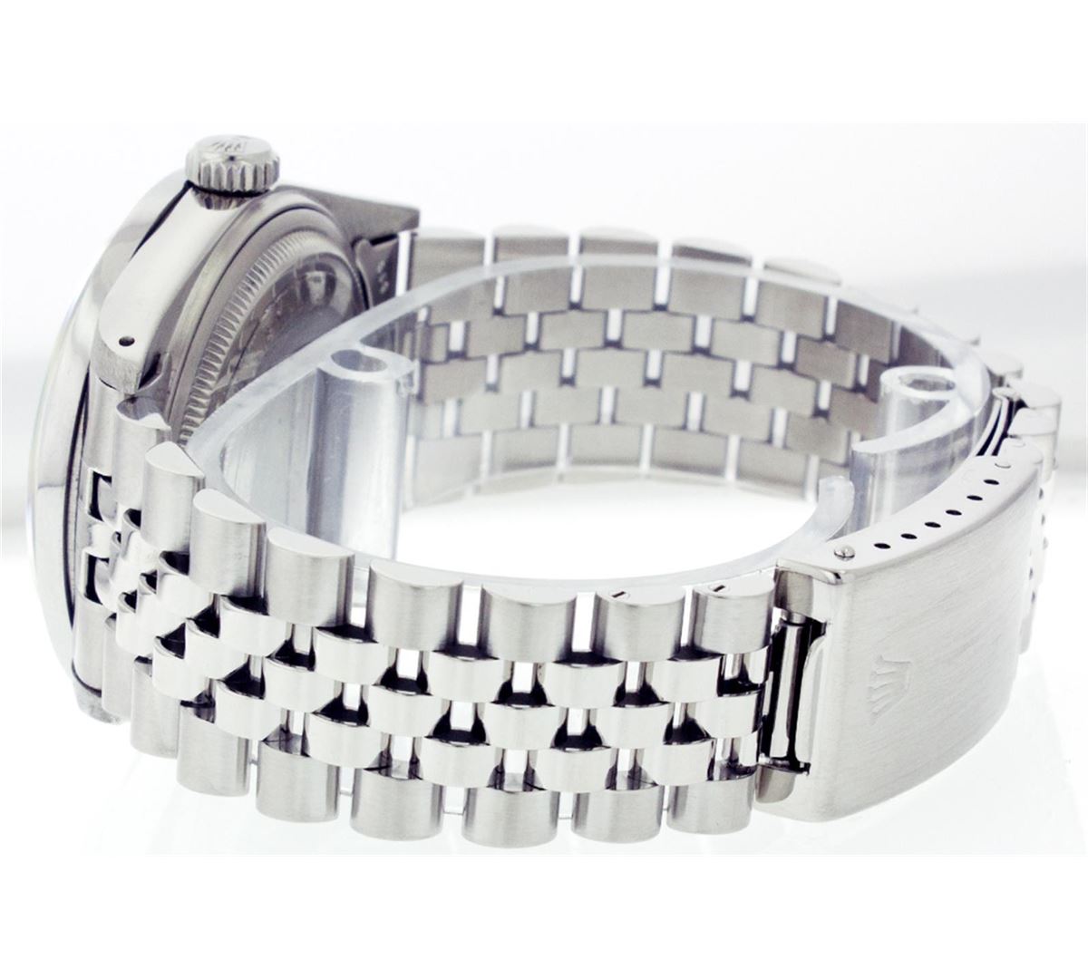One Mens Rolex Datejust Polished Bright with Satin Finish, Serviced & Electronically Tested, Stainless Steel Case:36mm, Stainless Steel Crown, Custom Bezel: Stainless Steel Beadset Diamond Bezel, Diamond Count: 54 Diamonds Total Weight 1.00 Carat, Clarity: SI-VS, Color: G to H. Custom Crystal: Synthetic Sapphire Cyclops Lens. Movement: Automatic Winding Movement Caliber 3035. Custom Dial: Silver With Diamond Hour Markers and Track, 10 Diamond in Dial G To H In Color, Clarity: SI-VS. Date Window: 3 O'Clock Position Date Display, Quickset, Model: 16014 Condition: G-6 Extra Fine. Bracelet:Stainless Steel Jubilee. Bright Polish & Satin Finish. 6.5 Inch Length, Adjustable. Standard Clasp, With Rolex Logo.