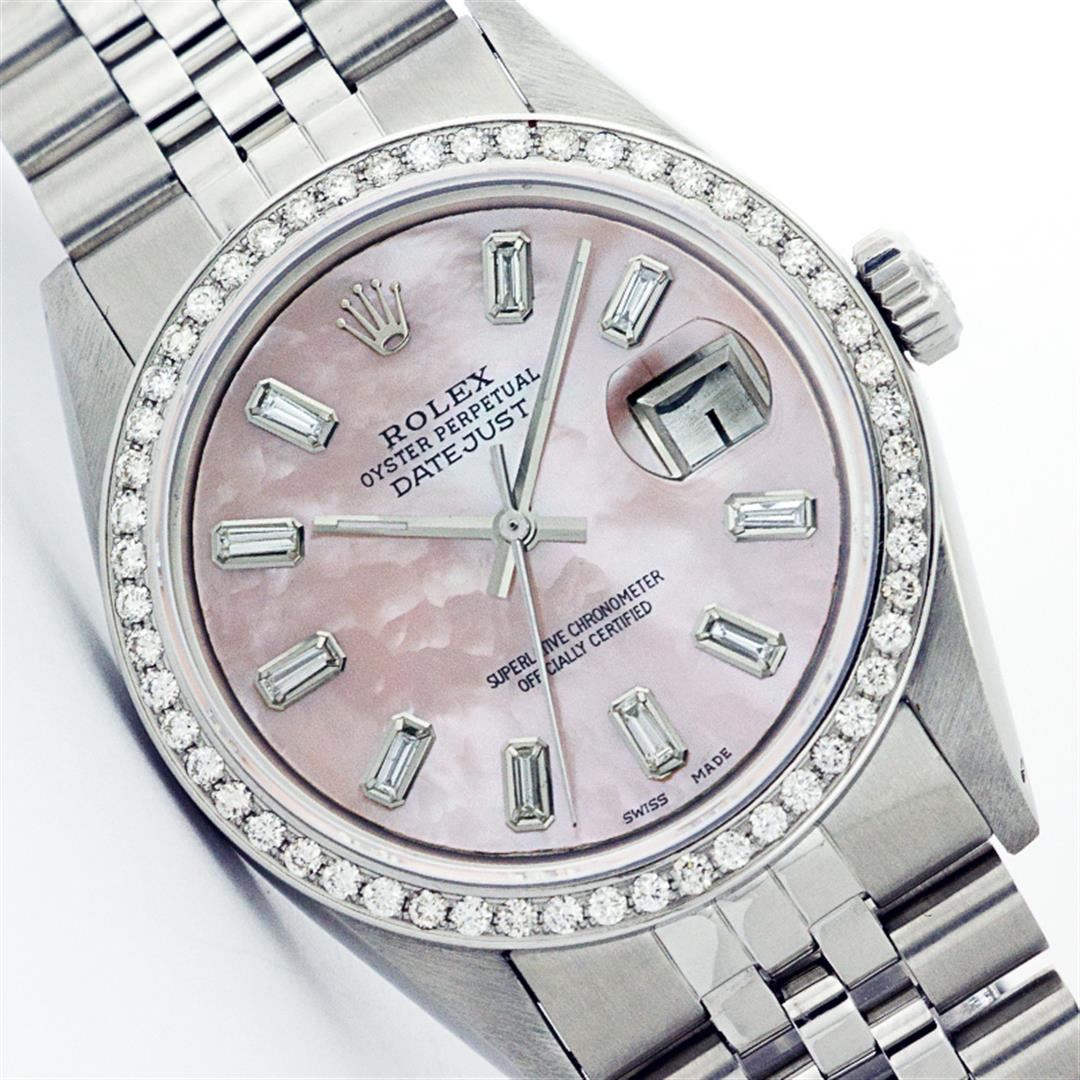 One Gents Rolex Datejust Polished, Serviced & Electronically Tested, Stainless Steel Case:36mm, Stainless Steel Crown, Custom Bezel: Stainless Steel Beadset Diamond Bezel, Diamond Count: 54 Diamonds, Total Weight 1.00 Carat, Clarity: SI-VS, Color: G to H. Custom Crystal: Synthetic Sapphire Cyclops Lens. Movement: Automatic Winding Movement Caliber 3035. Custom Dial: Pink Mother Of Pearl Baguette Diamond Dial, Diamond Count: 10 Baguette Diamonds Dial, Clarity: SI-VS, Color: G to H. Date Window: 3 O'Clock Position Date Display, Quickset, Model: 16014 Condition: G-6 Extra Fine. Bracelet: Stainless Steel Jubilee. Bright Polish & Satin Finish. 6.5 Inch Length, Adjustable. Standard Clasp, With Rolex Logo.