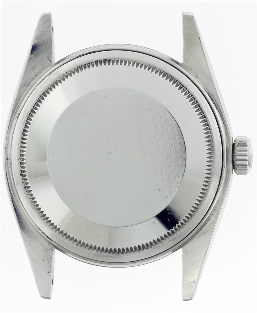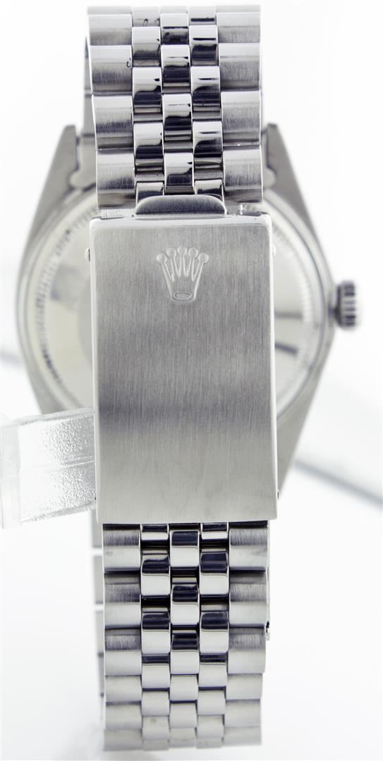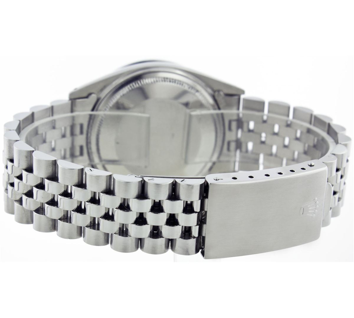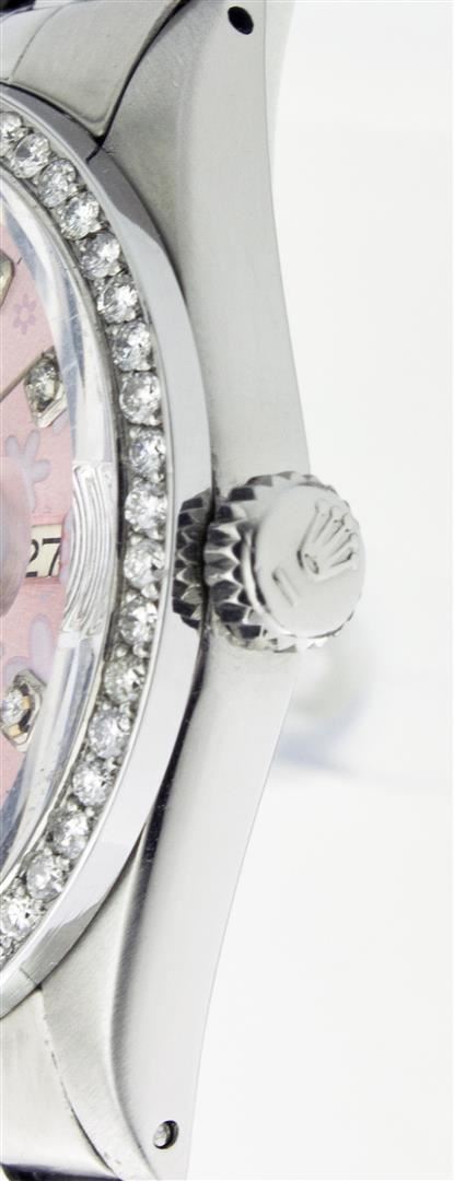 One Gents Rolex Datejust Polished, Serviced & Electronically Tested, Stainless Steel Case:36mm, Stainless Steel Crown, Custom Bezel: Stainless Steel Beadset Diamond Bezel, Total Weight: 1 Carat, Diamond Count: 54 Diamonds, Clarity: SI-VS, Color: G to H. Custom Crystal: Synthetic Sapphire Cyclops Lens. Movement: Automatic Winding Movement Caliber 3035. Custom Dial: Pink Floral With Diamond Hour Markers, Diamond Count: 10 Diamonds, Clarity: SI-VS, Color: G To H. Date Window: 3 O'Clock Position Date Display, Quickset, Model: 16014 Condition: G-6 Extra Fine. Bracelet: Stainless Steel Jubilee. Bright Polish & Satin Finish. 6.5 Inch Length, Adjustable. Standard Clasp, With Rolex Logo.