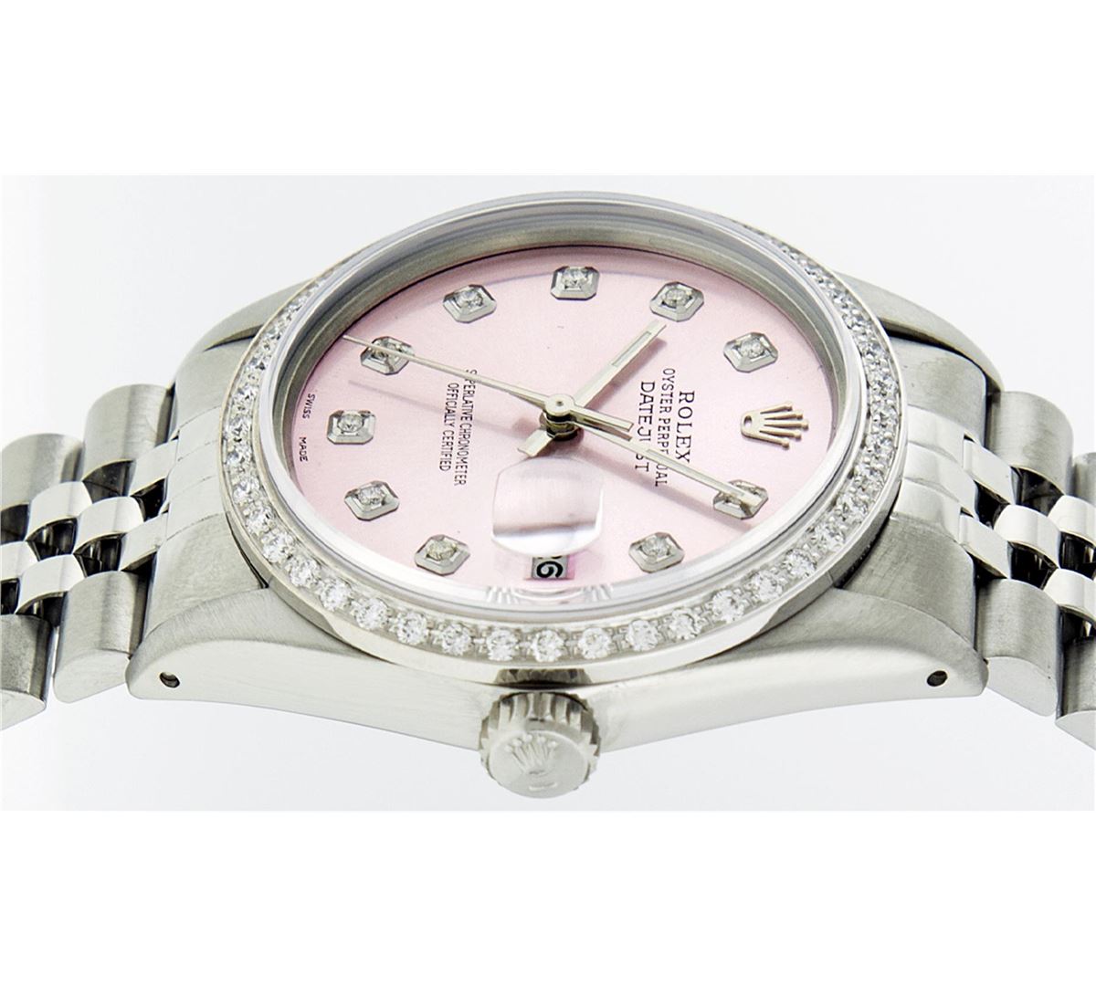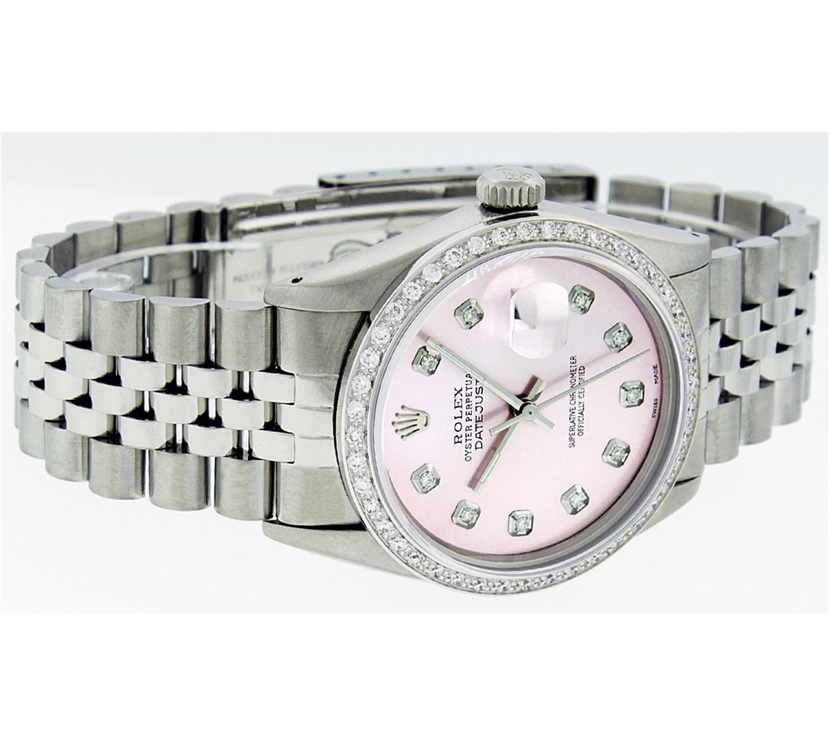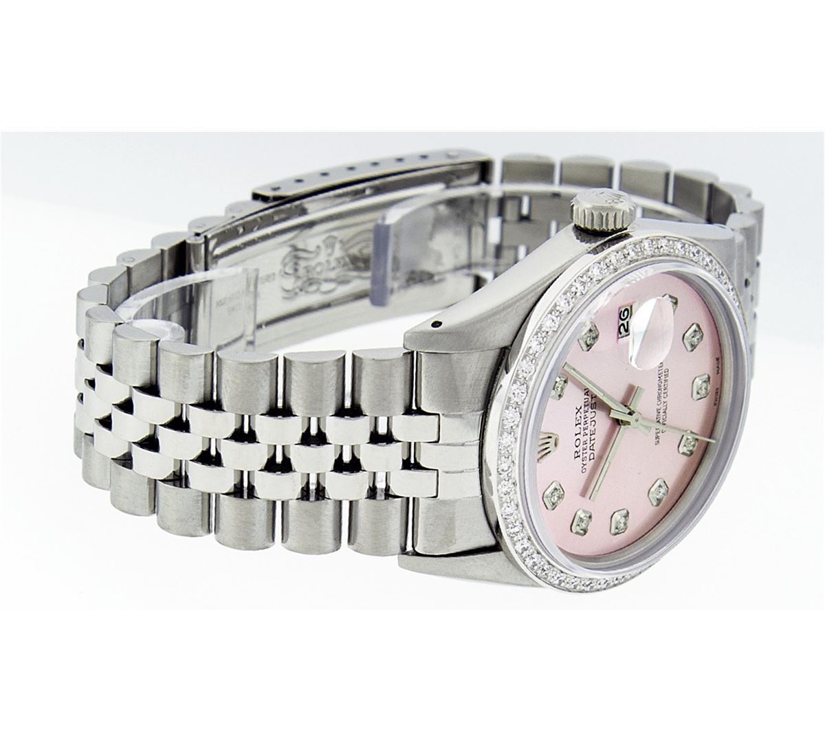One Gents Stainless Steel Rolex Datejust Polished Bright with Satin Finish, Fully Serviced & Electronically Tested, Stainless Steel Case:36mm, Stainless Steel Crown, Custom Bezel: 18K White Gold Beadset Diamond Bezel, Diamond Count: 44 Diamonds, Total Weight 1.00 Carat, Clarity: SI-VS, Color: G to H. Custom Crystal: Synthetic Sapphire Cyclops Lens. Movement: Automatic Winding Movement Caliber 3035. Custom Dial: Ice Pink Diamond Dial, 10 Diamonds in Dial, G To H In Color, Clarity: SI-VS. Date Window: 3 O'Clock Position Date Display, Quickset, Model: Datejust, Condition: G-6 Extra Fine. Bracelet: Stainless Steel Jubilee. Bright Polish & Satin Finish. 7.0 Inch Length, Adjustable. Standard Clasp, With Rolex Logo. Comes with 6 month warranty.