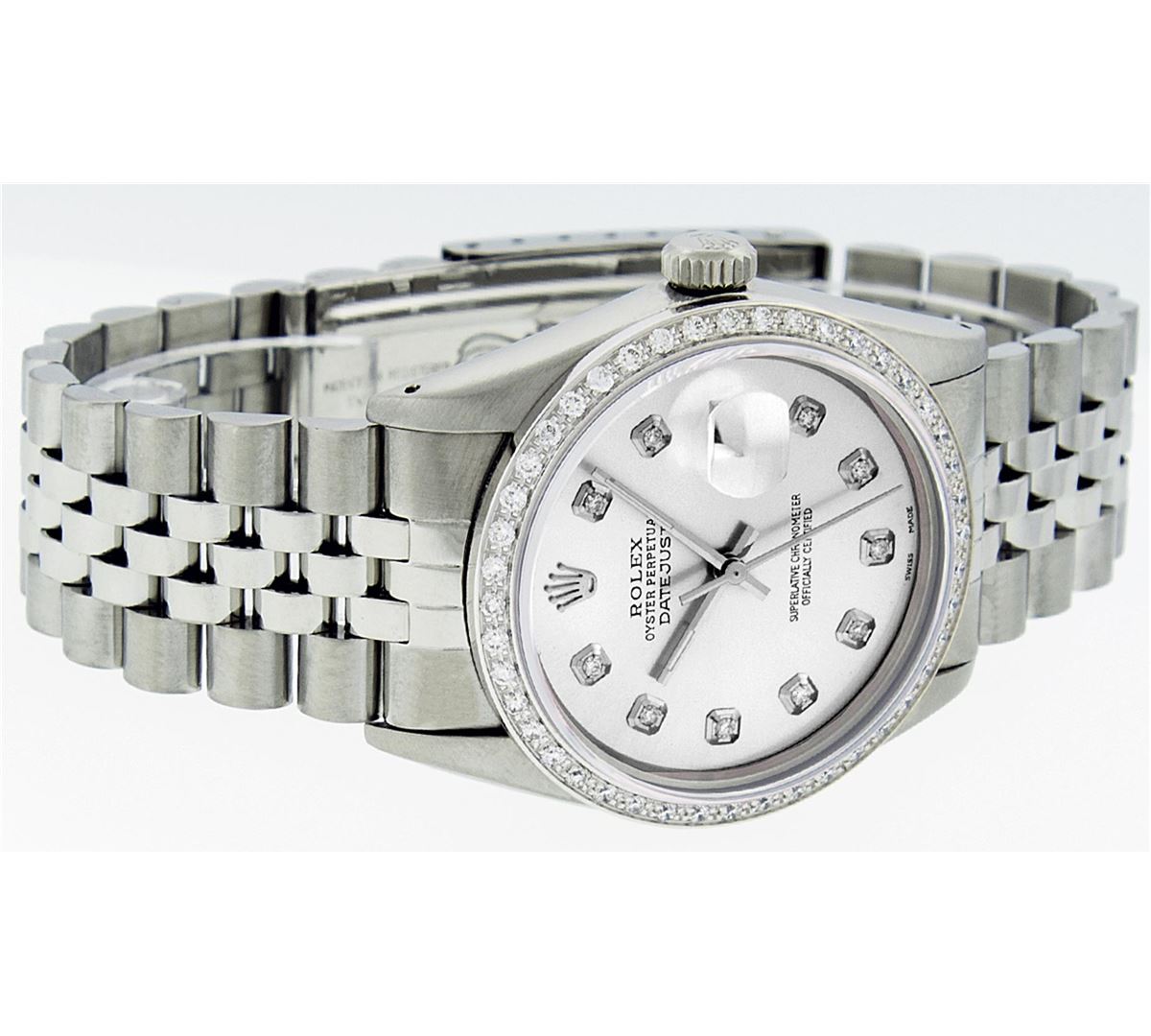 One Mens Stainless Steel Rolex Datejust Polished Bright with Satin Finish, Fully Serviced & Electronically Tested, Stainless Steel Case:36mm, Stainless Steel Crown, Custom Bezel: 18K White Gold Beadset Diamond Bezel, Diamond Count: 44 Diamonds Total Weight 1.00 Carat, Clarity: SI-VS, Color: G to H. Custom Crystal: Synthetic Sapphire Cyclops Lens. Movement: Automatic Winding Movement Caliber 3035. Custom Dial: Silver With Diamond Hour Markers, 10 Diamonds in Dial G To H In Color, Clarity: SI-VS. Date Window: 3 O'Clock Position Date Display, Quickset, Model: Datejust, Condition: G-6 Extra Fine. Bracelet: Stainless Steel Jubilee. Bright Polish & Satin Finish. 7.0 Inch Length, Adjustable. Standard Clasp, With Rolex Logo. Comes with 6 month warranty.