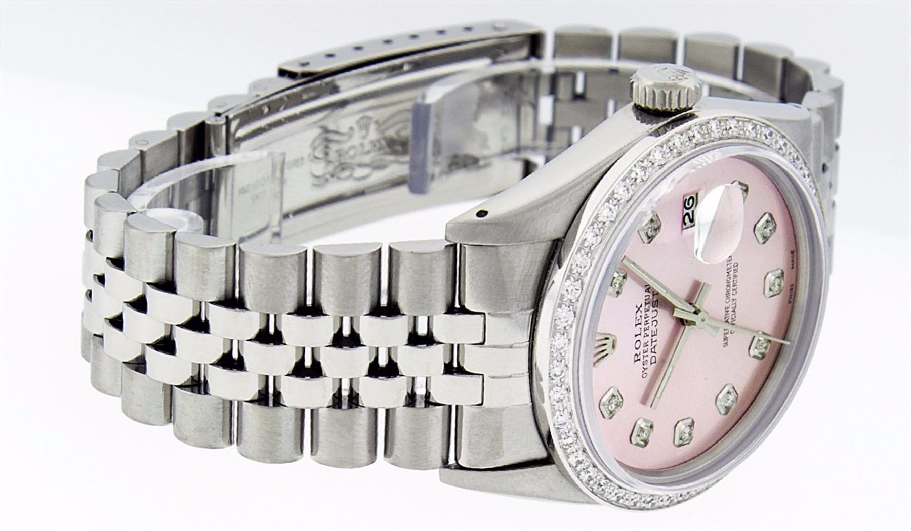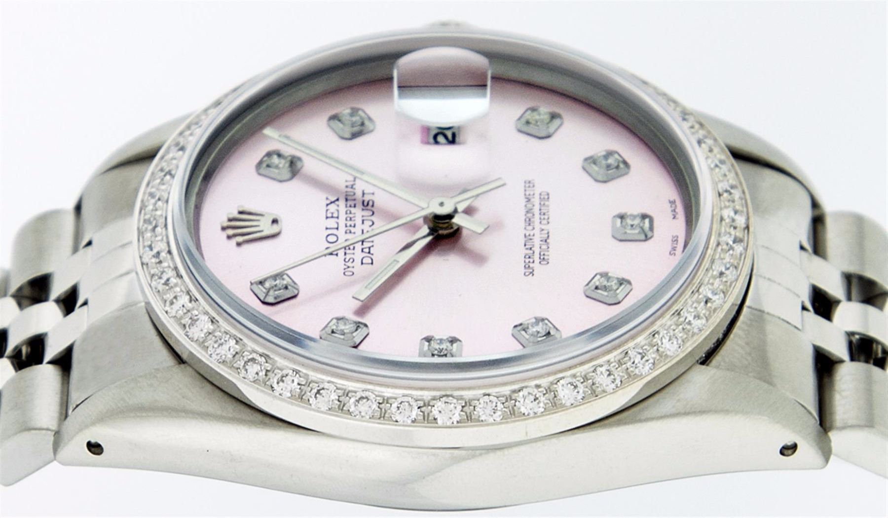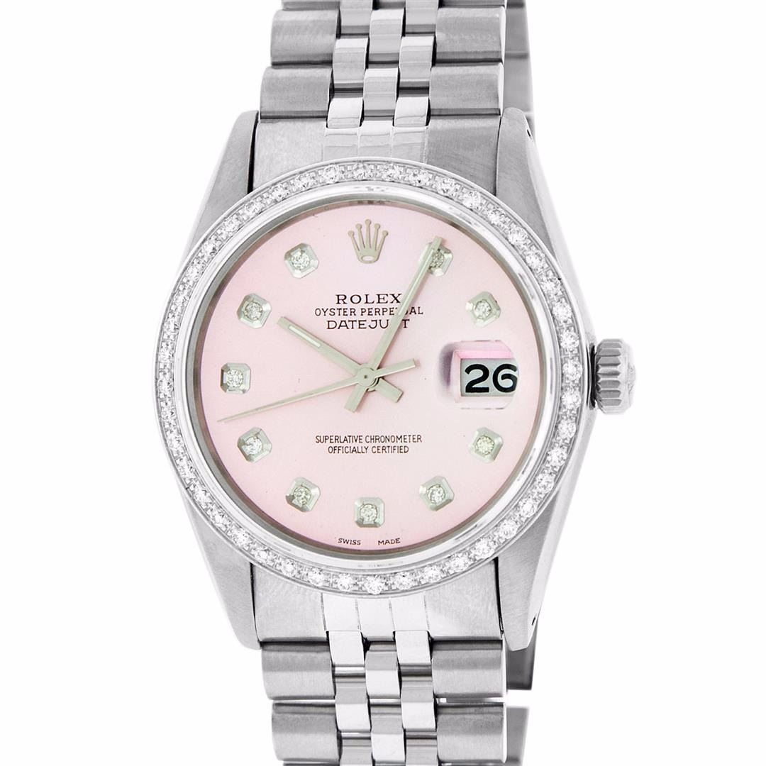 One Gents Stainless Steel Rolex Datejust Polished Bright with Satin Finish, Fully Serviced & Electronically Tested, Stainless Steel Case:36mm, Stainless Steel Crown, Custom Bezel: 18K White Gold Beadset Diamond Bezel, Diamond Count: 44 Diamonds, Total Weight 1.00 Carat, Clarity: SI-VS, Color: G to H. Custom Crystal: Synthetic Sapphire Cyclops Lens. Movement: Automatic Winding Movement Caliber 3035. Custom Dial: Ice Pink Diamond Dial, 10 Diamonds in Dial, G To H In Color, Clarity: SI-VS. Date Window: 3 O'Clock Position Date Display, Quickset, Model: Datejust, Condition: G-6 Extra Fine. Bracelet: Stainless Steel Jubilee. Bright Polish & Satin Finish. 7.0 Inch Length, Adjustable. Standard Clasp, With Rolex Logo. Comes with 6 month warranty.