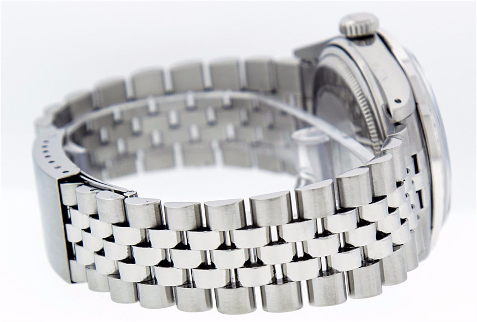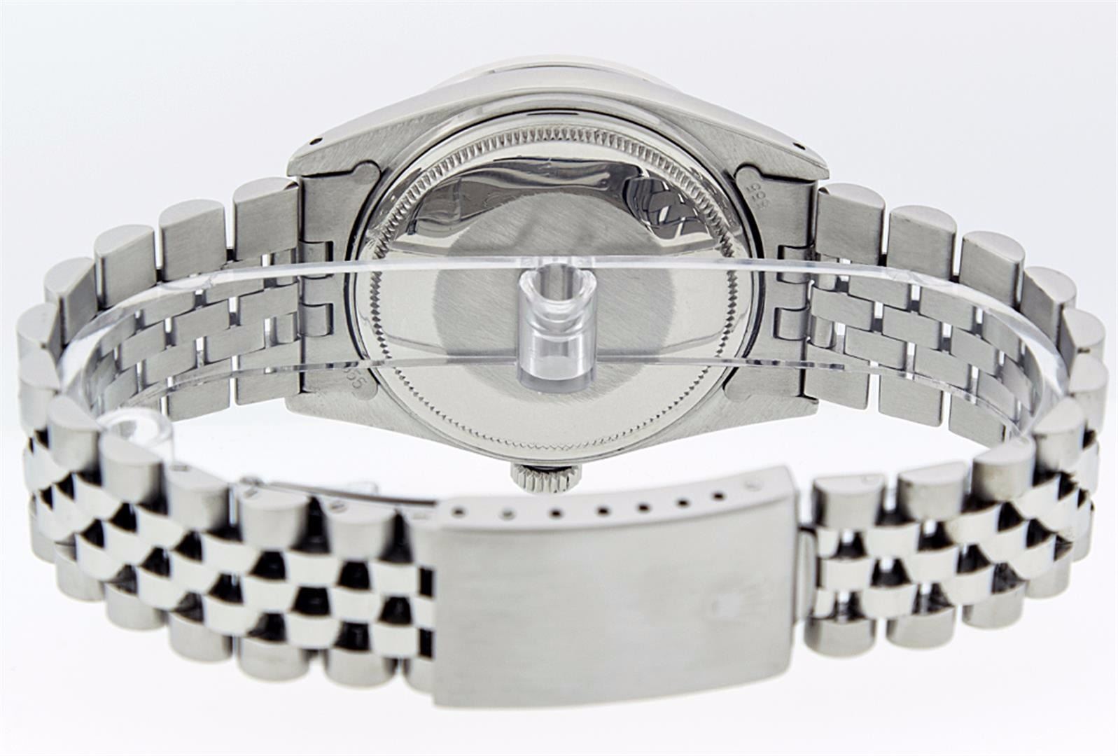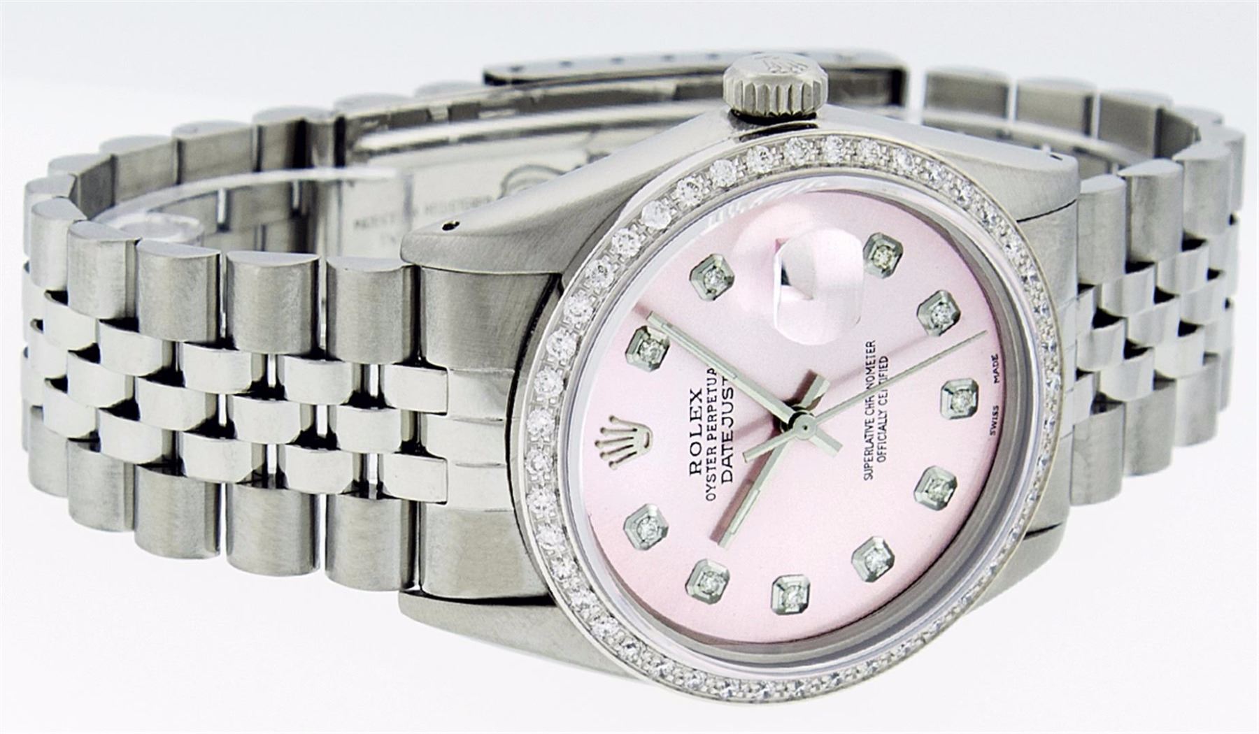 One Gents Stainless Steel Rolex Datejust Polished Bright with Satin Finish, Fully Serviced & Electronically Tested, Stainless Steel Case:36mm, Stainless Steel Crown, Custom Bezel: 18K White Gold Beadset Diamond Bezel, Diamond Count: 44 Diamonds, Total Weight 1.00 Carat, Clarity: SI-VS, Color: G to H. Custom Crystal: Synthetic Sapphire Cyclops Lens. Movement: Automatic Winding Movement Caliber 3035. Custom Dial: Ice Pink Diamond Dial, 10 Diamonds in Dial, G To H In Color, Clarity: SI-VS. Date Window: 3 O'Clock Position Date Display, Quickset, Model: Datejust, Condition: G-6 Extra Fine. Bracelet: Stainless Steel Jubilee. Bright Polish & Satin Finish. 7.0 Inch Length, Adjustable. Standard Clasp, With Rolex Logo. Comes with 6 month warranty.