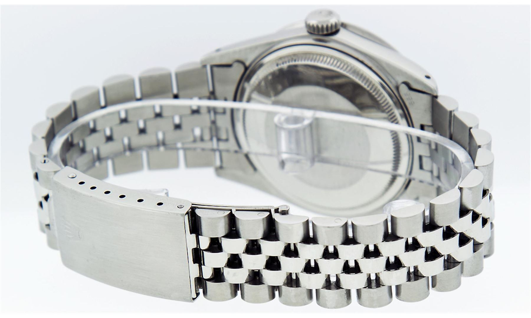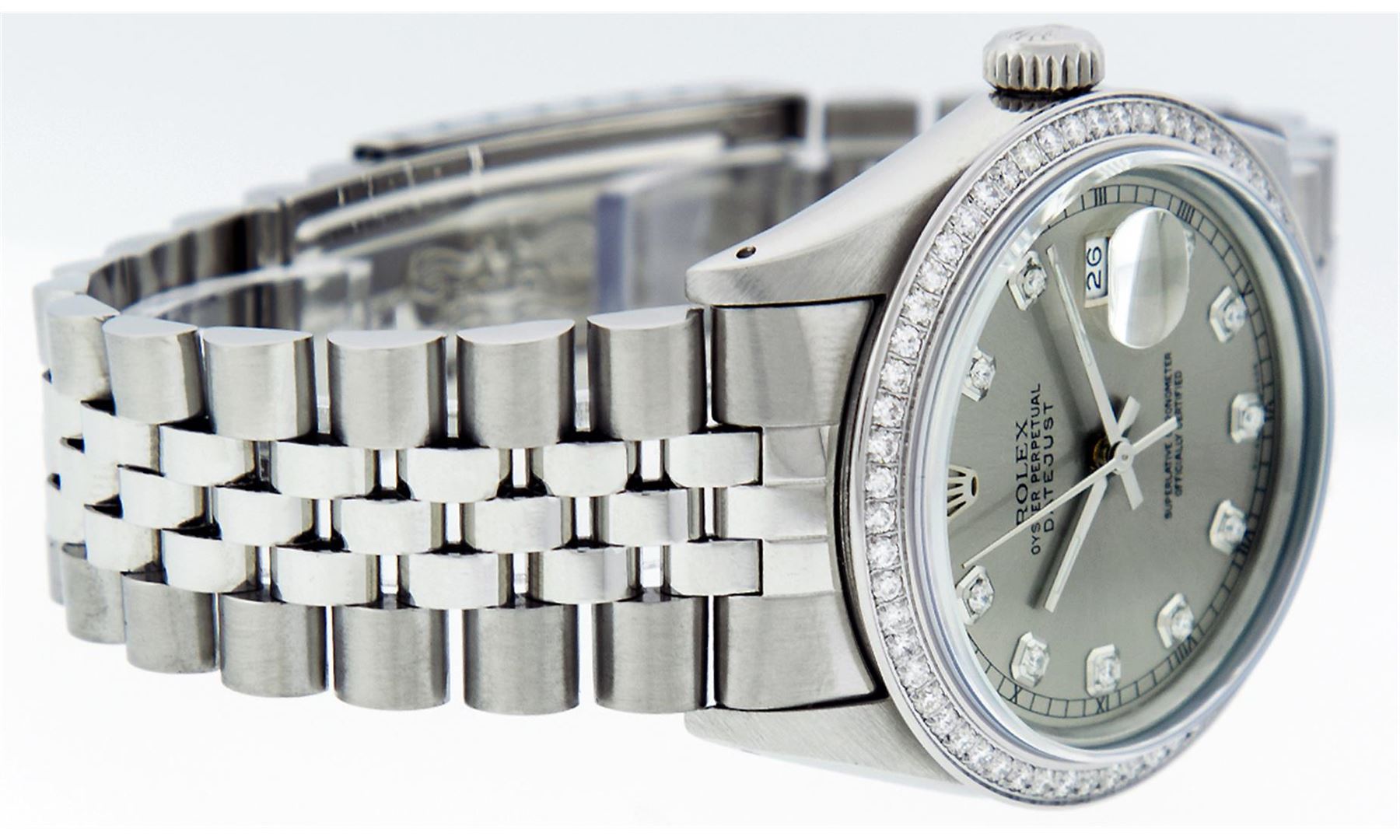 One Mens Rolex Datejust Polished Bright with Satin Finish, Serviced & Electronically Tested, Stainless Steel Case:36mm, Stainless Steel Crown, Custom Bezel: Stainless Steel Beadset Diamond Bezel, Diamond Count: 54 Diamonds Total Weight 1.00 Carat, Clarity: SI-VS, Color: G to H. Custom Crystal: Synthetic Sapphire Cyclops Lens. Movement: Automatic Winding Movement Caliber 3035. Custom Dial: Slate Grey With Diamond Hour Markers and Track, 10 Diamond in Dial G To H In Color, Clarity: SI-VS. Date Window: 3 O'Clock Position Date Display, Quickset, Model: Datejust Condition: G-6 Extra Fine. Bracelet: Stainless Steel Jubilee. Bright Polish & Satin Finish. 7.0 Inch Length, Adjustable. Standard Clasp, With Rolex Logo.