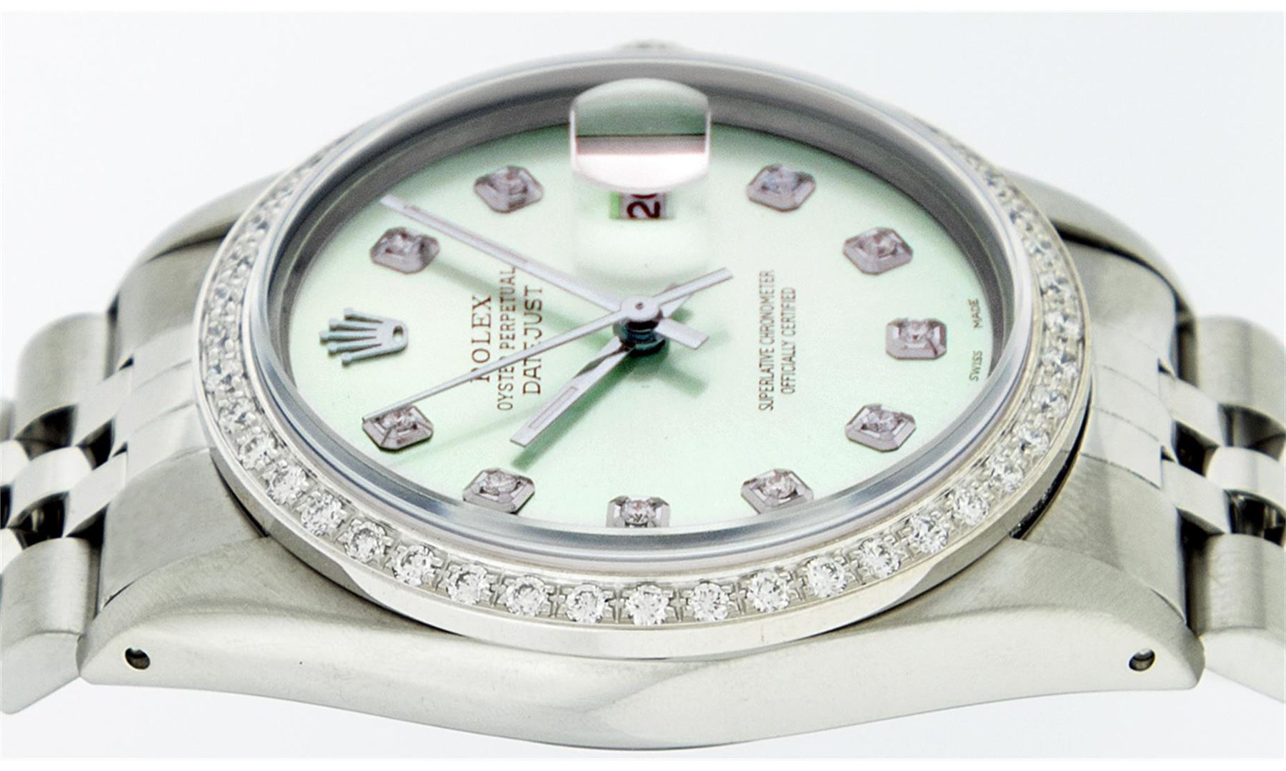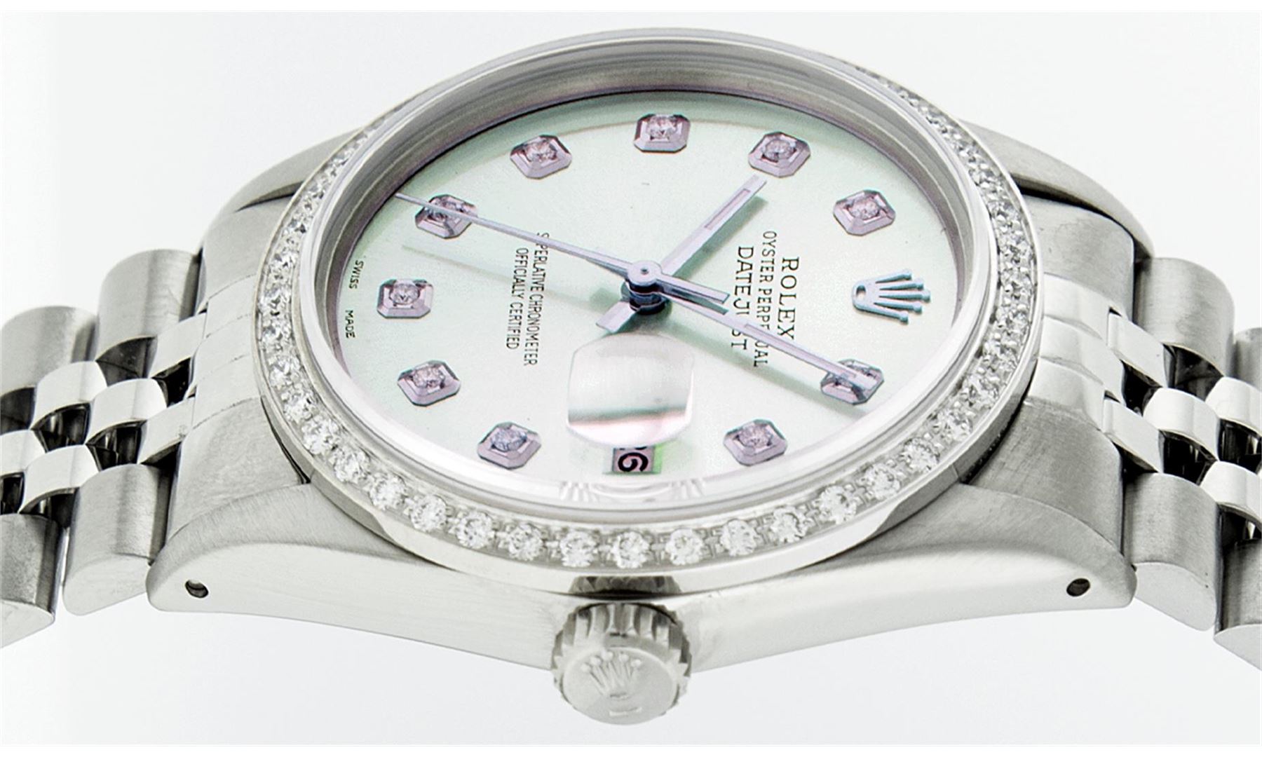 One Mens Stainless Steel Rolex Datejust Polished Bright with Satin Finish, Fully Serviced & Electronically Tested, Stainless Steel Case:36mm, Stainless Steel Crown, Custom Bezel: 18K White Gold Beadset Diamond Bezel, Diamond Count: 44 Diamonds Total Weight 1.00 Carat, Clarity: SI-VS, Color: G to H. Custom Crystal: Synthetic Sapphire Cyclops Lens. Movement: Automatic Winding Movement Caliber 3035. Custom Dial: Ice Green With Diamond Hour Markers, 10 Diamonds in Dial G To H In Color, Clarity: SI-VS. Date Window: 3 O'Clock Position Date Display, Quickset, Model: Datejust, Condition: G-6 Extra Fine. Bracelet: Stainless Steel Jubilee. Bright Polish & Satin Finish. 7.0 Inch Length, Adjustable. Standard Clasp, With Rolex Logo. Comes with 6 month warranty.