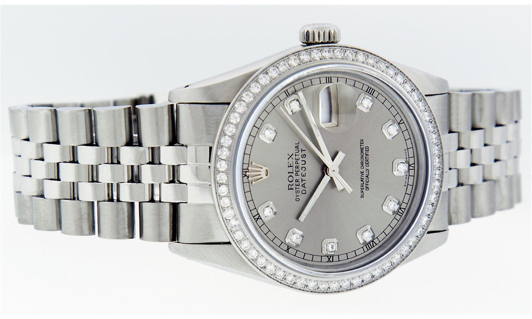 One Mens Rolex Datejust Polished Bright with Satin Finish, Serviced & Electronically Tested, Stainless Steel Case:36mm, Stainless Steel Crown, Custom Bezel: Stainless Steel Beadset Diamond Bezel, Diamond Count: 54 Diamonds Total Weight 1.00 Carat, Clarity: SI-VS, Color: G to H. Custom Crystal: Synthetic Sapphire Cyclops Lens. Movement: Automatic Winding Movement Caliber 3035. Custom Dial: Slate Grey With Diamond Hour Markers and Track, 10 Diamond in Dial G To H In Color, Clarity: SI-VS. Date Window: 3 O'Clock Position Date Display, Quickset, Model: Datejust Condition: G-6 Extra Fine. Bracelet: Stainless Steel Jubilee. Bright Polish & Satin Finish. 7.0 Inch Length, Adjustable. Standard Clasp, With Rolex Logo.