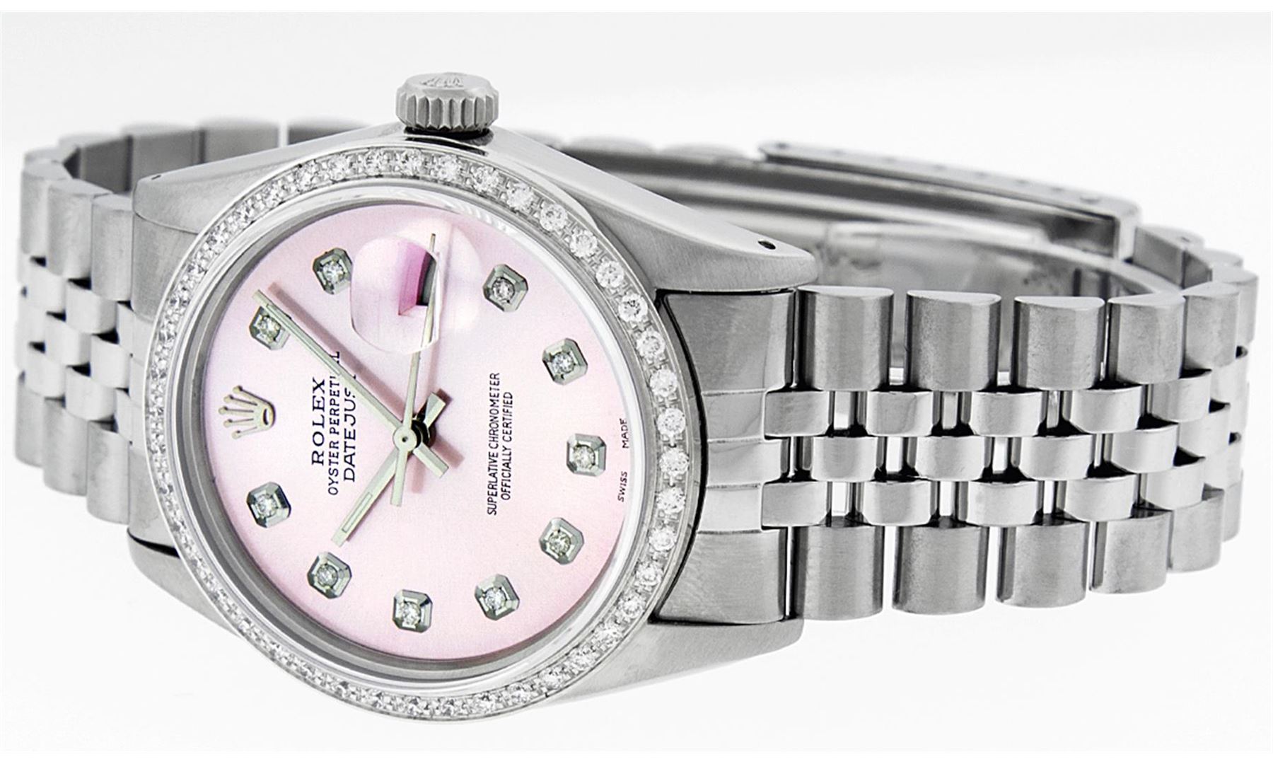 One Gents Stainless Steel Rolex Datejust Polished Bright with Satin Finish, Fully Serviced & Electronically Tested, Stainless Steel Case:36mm, Stainless Steel Crown, Custom Bezel: 18K White Gold Beadset Diamond Bezel, Diamond Count: 44 Diamonds, Total Weight 1.00 Carat, Clarity: SI-VS, Color: G to H. Custom Crystal: Synthetic Sapphire Cyclops Lens. Movement: Automatic Winding Movement Caliber 3035. Custom Dial: Ice Pink Diamond Dial, 10 Diamonds in Dial, G To H In Color, Clarity: SI-VS. Date Window: 3 O'Clock Position Date Display, Quickset, Model: Datejust, Condition: G-6 Extra Fine. Bracelet: Stainless Steel Jubilee. Bright Polish & Satin Finish. 7.0 Inch Length, Adjustable. Standard Clasp, With Rolex Logo. Comes with 6 month warranty.