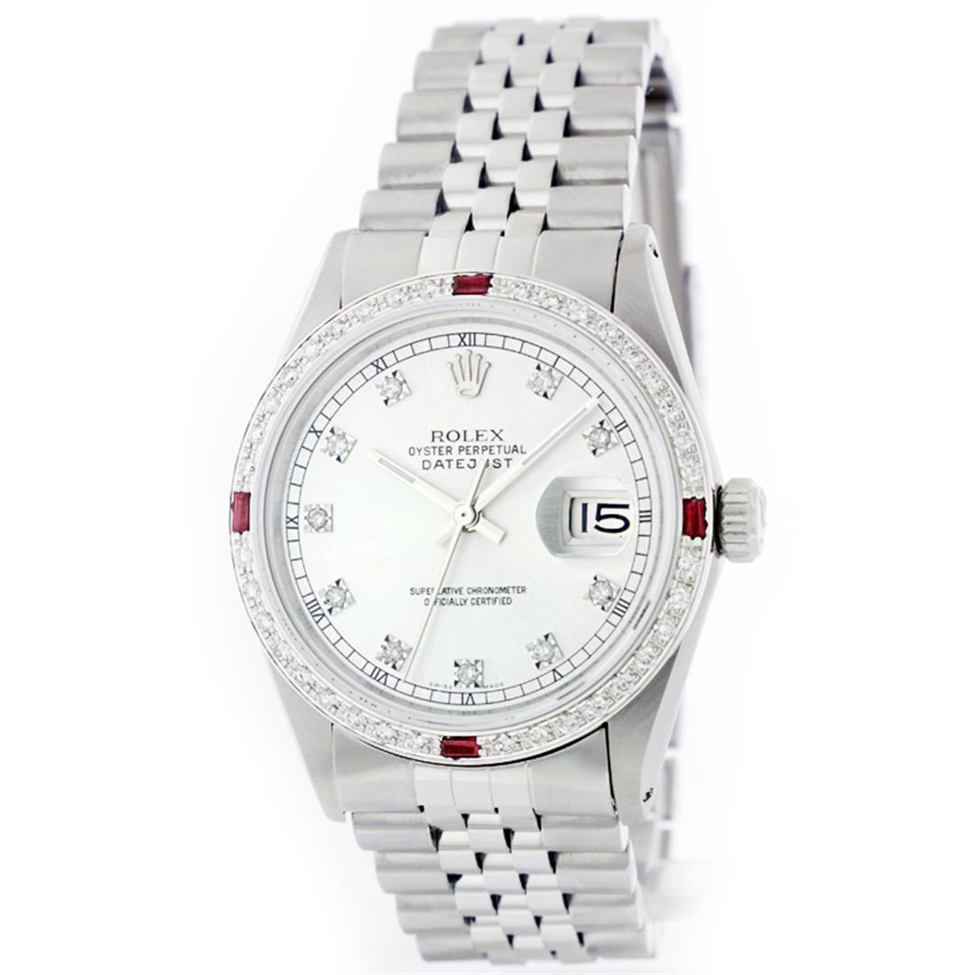 One Gents Stainless Steel Rolex Datejust Polished Bright with Satin Finish, Fully Serviced & Electronically Tested, Stainless Steel Case:36mm, Stainless Steel Crown, Custom Bezel: 18K White Gold Ruby Beadset Diamond Bezel, Diamond Count: 36 Diamonds + 4 Rubies, Total Weight 1.00 Carat, Clarity: SI-VS, Color: G to H. Custom Crystal: Synthetic Sapphire Cyclops Lens. Movement: Automatic Winding Movement Caliber 3035. Custom Dial: White Dial With Diamond Hour Markers and Square Roman Track, 10 Diamonds in Dial G To H In Color, Clarity: SI-VS. Date Window: 3 O'Clock Position Date Display, Quickset, Model: Datejust, Condition: G-6 Extra Fine. Bracelet: Stainless Steel Jubilee. Bright Polish & Satin Finish. 6.5 Inch Length, Adjustable. Standard Clasp, With Rolex Logo.