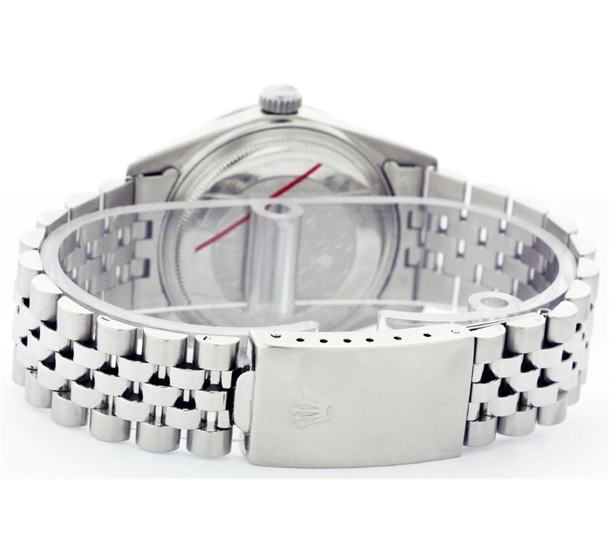 One Gents Stainless Steel Rolex Datejust Polished Bright with Satin Finish, Fully Serviced & Electronically Tested, Stainless Steel Case:36mm, Stainless Steel Crown, Custom Bezel: 18K White Gold Ruby Beadset Diamond Bezel, Diamond Count: 36 Diamonds + 4 Rubies, Total Weight 1.00 Carat, Clarity: SI-VS, Color: G to H. Custom Crystal: Synthetic Sapphire Cyclops Lens. Movement: Automatic Winding Movement Caliber 3035. Custom Dial: Mother Of Pearl Diamond Dial, 10 Diamonds in Dial, G To H In Color, Clarity: SI-VS. Date Window: 3 O'Clock Position Date Display, Quickset, Model: Datejust, Condition: G-6 Extra Fine. Bracelet: Stainless Steel Jubilee. Bright Polish & Satin Finish. 6.5 Inch Length, Adjustable. Standard Clasp, With Rolex Logo.