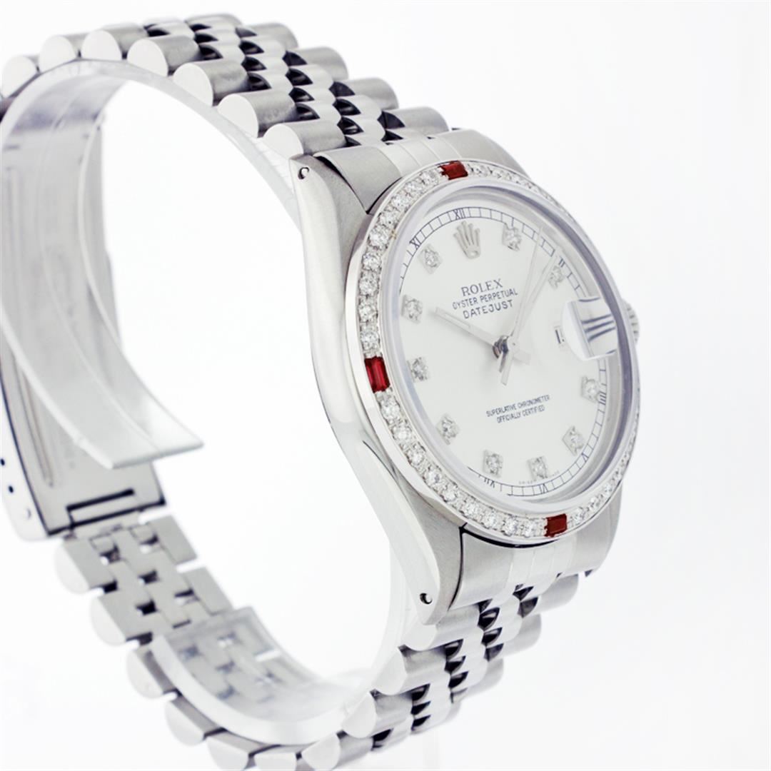 One Gents Stainless Steel Rolex Datejust Polished Bright with Satin Finish, Fully Serviced & Electronically Tested, Stainless Steel Case:36mm, Stainless Steel Crown, Custom Bezel: 18K White Gold Ruby Beadset Diamond Bezel, Diamond Count: 36 Diamonds + 4 Rubies, Total Weight 1.00 Carat, Clarity: SI-VS, Color: G to H. Custom Crystal: Synthetic Sapphire Cyclops Lens. Movement: Automatic Winding Movement Caliber 3035. Custom Dial: White Dial With Diamond Hour Markers and Square Roman Track, 10 Diamonds in Dial G To H In Color, Clarity: SI-VS. Date Window: 3 O'Clock Position Date Display, Quickset, Model: Datejust, Condition: G-6 Extra Fine. Bracelet: Stainless Steel Jubilee. Bright Polish & Satin Finish. 6.5 Inch Length, Adjustable. Standard Clasp, With Rolex Logo.