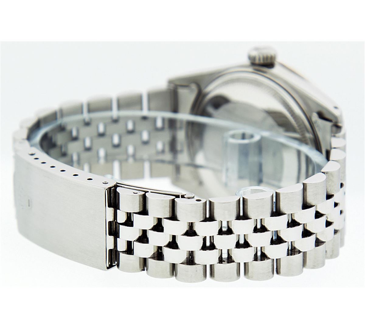 One Gents Rolex Datejust Polished, Serviced & Electronically Tested, Stainless Steel Case:36mm, Stainless Steel Crown, Custom Bezel: 18K White Gold Ruby Beadset Diamond Bezel, Diamond + Gem Count: 36 Diamonds + 4 Rubies. Total Weight 1.00 Carat, Clarity: SI-VS, Color: G to H. Custom Crystal: Synthetic Sapphire Cyclops Lens. Movement: Automatic Winding Movement Caliber 3035. Custom Dial: Black With Diamond Hour Markers Square Roman Track, 10 Diamond Dial Square Setting. G To H In Color, Clarity: SI-VS. Date Window: 3 O'Clock Position Date Display, Quickset, Model: Datejust. Condition: G-6 Extra Fine. Bracelet: Stainless Steel Jubilee. Bright Polish & Satin Finish. 7.0 Inch Length, Adjustable. Standard Clasp, With Rolex Logo. Comes with 6 month warranty.