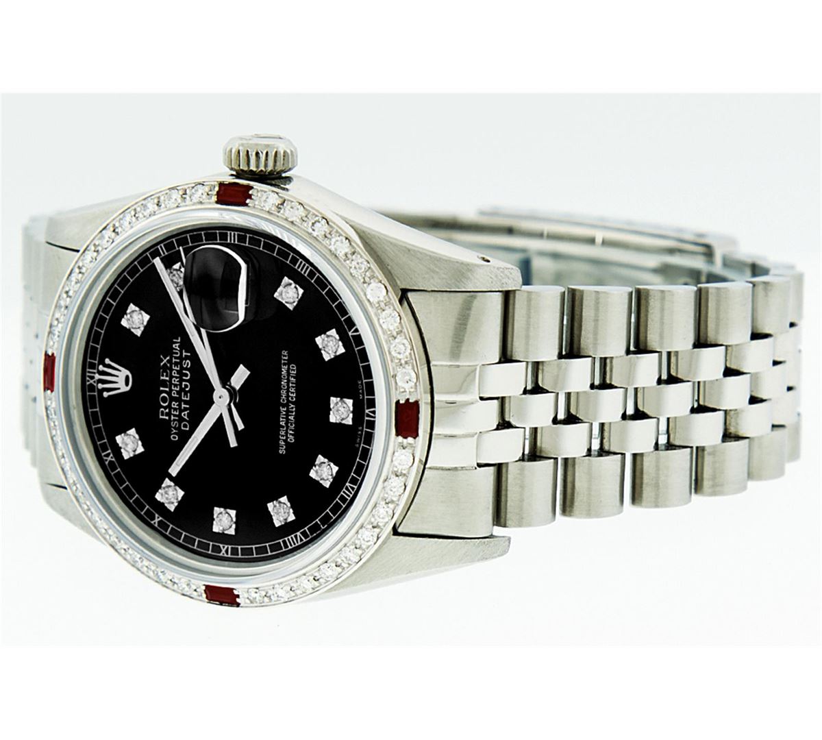 One Gents Rolex Datejust Polished, Serviced & Electronically Tested, Stainless Steel Case:36mm, Stainless Steel Crown, Custom Bezel: 18K White Gold Ruby Beadset Diamond Bezel, Diamond + Gem Count: 36 Diamonds + 4 Rubies. Total Weight 1.00 Carat, Clarity: SI-VS, Color: G to H. Custom Crystal: Synthetic Sapphire Cyclops Lens. Movement: Automatic Winding Movement Caliber 3035. Custom Dial: Black With Diamond Hour Markers Square Roman Track, 10 Diamond Dial Square Setting. G To H In Color, Clarity: SI-VS. Date Window: 3 O'Clock Position Date Display, Quickset, Model: Datejust. Condition: G-6 Extra Fine. Bracelet: Stainless Steel Jubilee. Bright Polish & Satin Finish. 7.0 Inch Length, Adjustable. Standard Clasp, With Rolex Logo. Comes with 6 month warranty.