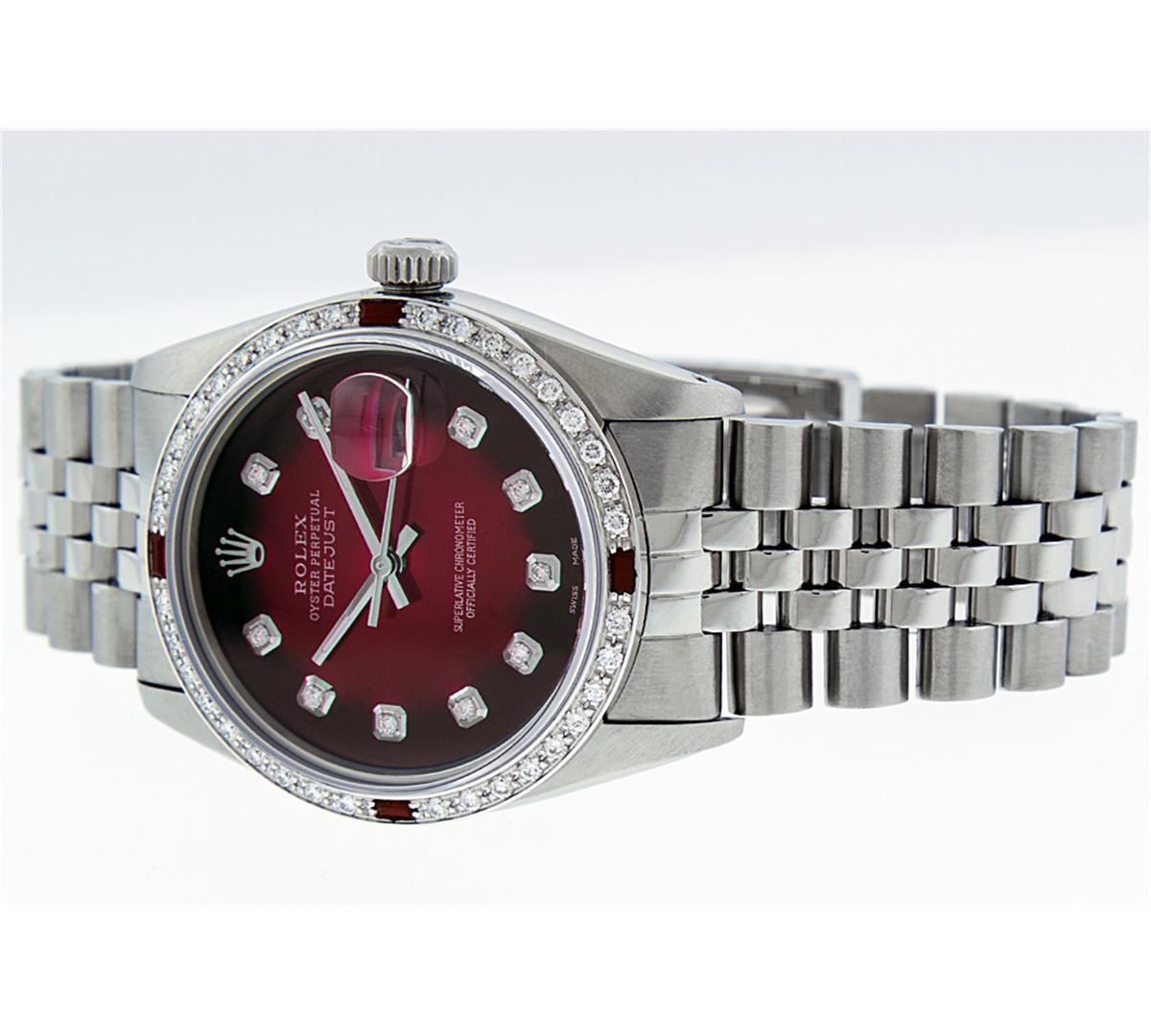 One Gents Rolex Datejust Polished, Serviced & Electronically Tested, Stainless Steel Case:36mm, Stainless Steel Crown, Custom Bezel: 18K White Gold Ruby Beadset Diamond Bezel, Diamond + Gem Count: 36 Diamonds + 4 Rubies Total Weight 1.00 Carat, Clarity: SI-VS, Color: G to H. Custom Crystal: Synthetic Sapphire Cyclops Lens. Movement: Automatic Winding Movement Caliber 3035. Custom Dial: Red Vignette With Diamond Hour Markers, 10 Diamond Dial G To H In Color, Clarity: SI-VS. Date Window: 3 O'Clock Position Date Display, Quickset, Model: Datejust. Condition: G-6 Extra Fine. Bracelet: Stainless Steel Jubilee. Bright Polish & Satin Finish. 7.0 Inch Length, Adjustable. Standard Clasp, With Rolex Logo. Comes with 6 month warranty.