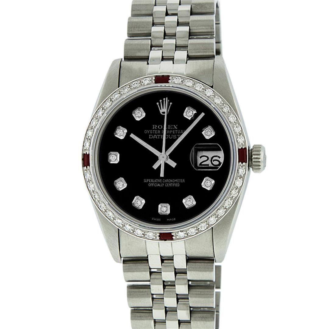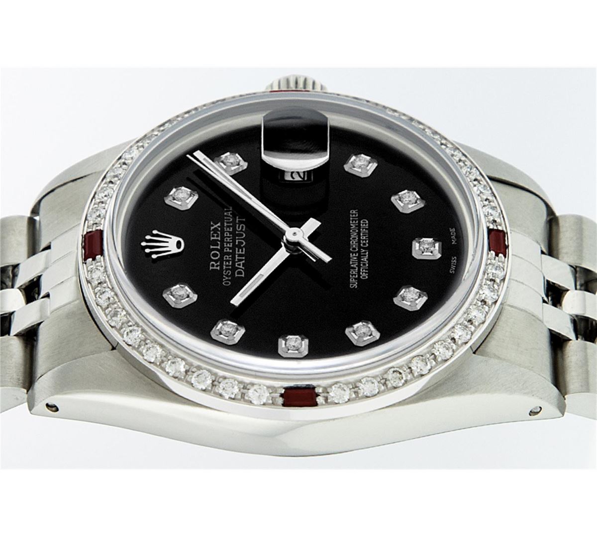 One Gents Rolex Datejust Polished, Serviced & Electronically Tested, Stainless Steel Case:36mm, Stainless Steel Crown, Custom Bezel: 18K White Gold Ruby Beadset Diamond Bezel, Diamond + Gem Count: 36 Diamonds + 4 Rubies. Total Weight 1.00 Carat, Clarity: SI-VS, Color: G to H. Custom Crystal: Synthetic Sapphire Cyclops Lens. Movement: Automatic Winding Movement Caliber 3035. Custom Dial: Black With Diamond Hour Markers, 10 Diamond Dial G To H In Color, Clarity: SI-VS. Date Window: 3 O'Clock Position Date Display, Quickset, Model: Datejust. Condition: G-6 Extra Fine. Bracelet: Stainless Steel Jubilee. Bright Polish & Satin Finish. 7.0 Inch Length, Adjustable. Standard Clasp, With Rolex Logo. Comes with 6 month warranty.