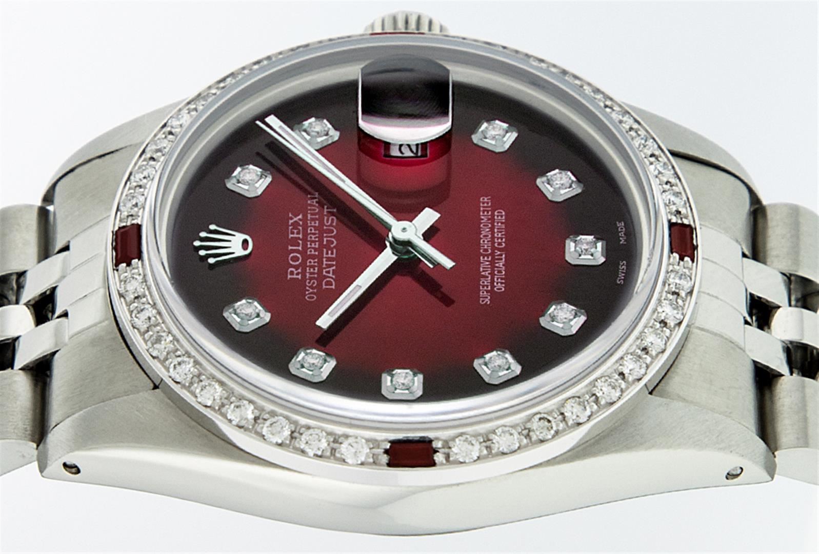 One Gents Rolex Datejust Polished, Serviced & Electronically Tested, Stainless Steel Case:36mm, Stainless Steel Crown, Custom Bezel: 18K White Gold Ruby Beadset Diamond Bezel, Diamond + Gem Count: 36 Diamonds + 4 Rubies Total Weight 1.00 Carat, Clarity: SI-VS, Color: G to H. Custom Crystal: Synthetic Sapphire Cyclops Lens. Movement: Automatic Winding Movement Caliber 3035. Custom Dial: Red Vignette With Diamond Hour Markers, 10 Diamond Dial G To H In Color, Clarity: SI-VS. Date Window: 3 O'Clock Position Date Display, Quickset, Model: Datejust. Condition: G-6 Extra Fine. Bracelet: Stainless Steel Jubilee. Bright Polish & Satin Finish. 7.0 Inch Length, Adjustable. Standard Clasp, With Rolex Logo. Comes with 6 month warranty.
