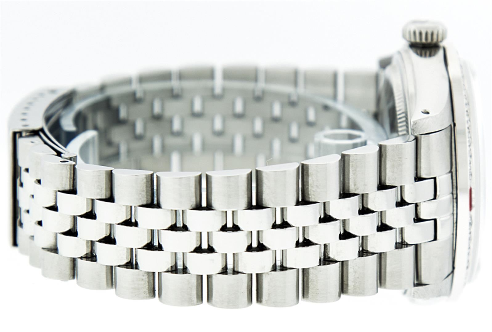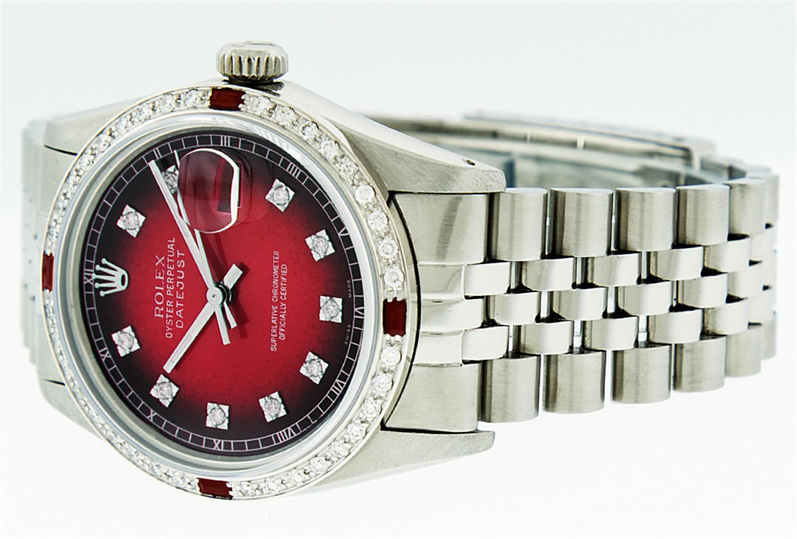 One Gents Rolex Datejust Polished, Serviced & Electronically Tested, Stainless Steel Case:36mm, Stainless Steel Crown, Custom Bezel: 18K White Gold Ruby Beadset Diamond Bezel, Diamond + Gem Count: 36 Diamonds + 4 Rubies Total Weight 1.00 Carat, Clarity: SI-VS, Color: G to H. Custom Crystal: Synthetic Sapphire Cyclops Lens. Movement: Automatic Winding Movement Caliber 3035. Custom Dial: Red Vignette With Diamond Hour Markers and Square Roman Track, 10 Diamond Dial G To H In Color, Clarity: SI-VS. Date Window: 3 O'Clock Position Date Display, Quickset, Model: Datejust. Condition: G-6 Extra Fine. Bracelet: Stainless Steel Jubilee. Bright Polish & Satin Finish. 7.0 Inch Length, Adjustable. Standard Clasp, With Rolex Logo. Comes with 6 month warranty.
