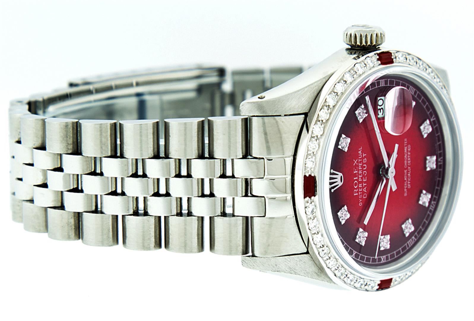 One Gents Rolex Datejust Polished, Serviced & Electronically Tested, Stainless Steel Case:36mm, Stainless Steel Crown, Custom Bezel: 18K White Gold Ruby Beadset Diamond Bezel, Diamond + Gem Count: 36 Diamonds + 4 Rubies Total Weight 1.00 Carat, Clarity: SI-VS, Color: G to H. Custom Crystal: Synthetic Sapphire Cyclops Lens. Movement: Automatic Winding Movement Caliber 3035. Custom Dial: Red Vignette With Diamond Hour Markers and Square Roman Track, 10 Diamond Dial G To H In Color, Clarity: SI-VS. Date Window: 3 O'Clock Position Date Display, Quickset, Model: Datejust. Condition: G-6 Extra Fine. Bracelet: Stainless Steel Jubilee. Bright Polish & Satin Finish. 7.0 Inch Length, Adjustable. Standard Clasp, With Rolex Logo. Comes with 6 month warranty.