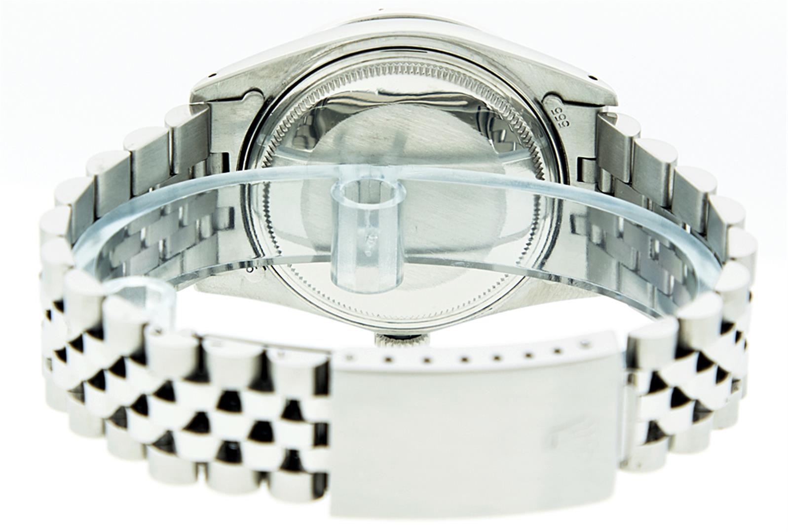 One Gents Rolex Datejust Polished, Serviced & Electronically Tested, Stainless Steel Case:36mm, Stainless Steel Crown, Custom Bezel: 18K White Gold Ruby Beadset Diamond Bezel, Diamond + Gem Count: 36 Diamonds + 4 Rubies Total Weight 1.00 Carat, Clarity: SI-VS, Color: G to H. Custom Crystal: Synthetic Sapphire Cyclops Lens. Movement: Automatic Winding Movement Caliber 3035. Custom Dial: Red Vignette With Diamond Hour Markers and Square Roman Track, 10 Diamond Dial G To H In Color, Clarity: SI-VS. Date Window: 3 O'Clock Position Date Display, Quickset, Model: Datejust. Condition: G-6 Extra Fine. Bracelet: Stainless Steel Jubilee. Bright Polish & Satin Finish. 7.0 Inch Length, Adjustable. Standard Clasp, With Rolex Logo. Comes with 6 month warranty.