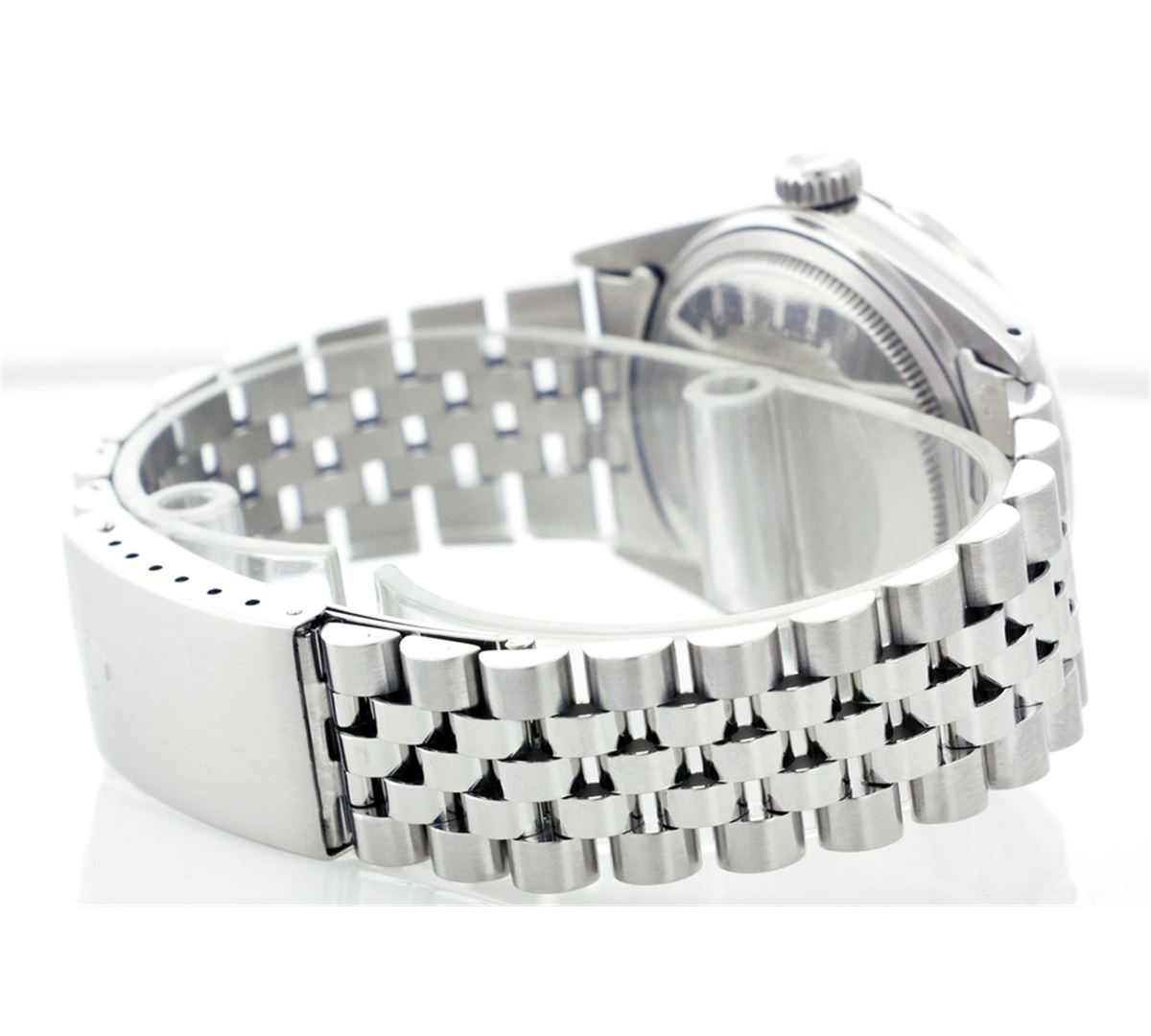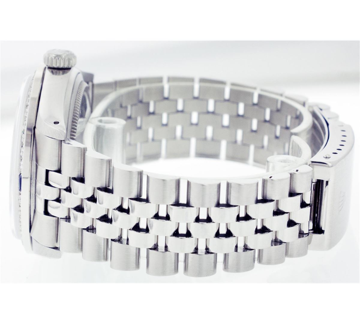 One Gents Rolex Datejust Polished, Serviced & Electronically Tested, Stainless Steel Case:36mm, Stainless Steel Crown, Custom Bezel: 18K White Gold Sapphire Beadset Diamond Bezel, Diamond Count: 36 Diamonds + 4 Sapphires, Total Weight 1.00 Carat, Clarity: SI-VS, Color: G to H. Custom Crystal: Synthetic Sapphire Cyclops Lens. Movement: Automatic Winding Movement Caliber 3035. Custom Dial: Black Diamond Dial, Diamond Count: 10 Diamonds In Dial, Clarity: SI-VS, Color: G to H. Date Window: 3 O'Clock Position Date Display, Quickset, Model: 16014 Condition: G-6 Extra Fine. Bracelet: Stainless Steel Jubilee. Bright Polish & Satin Finish. 6.5 Inch Length, Adjustable. Standard Clasp, With Rolex Logo.