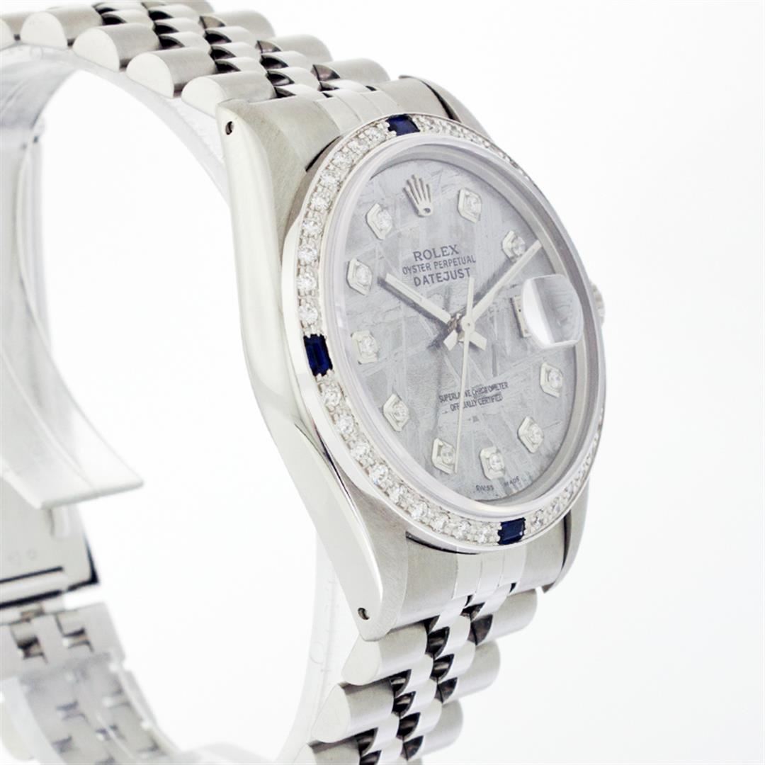 One Gents Stainless Steel Rolex Datejust Polished Bright with Satin Finish, Fully Serviced & Electronically Tested, Stainless Steel Case:36mm, Stainless Steel Crown, Custom Bezel: 18K White Gold Sapphire Beadset Diamond Bezel, Diamond Count: 36 Diamonds + 4 Sapphire, Total Weight 1.00 Carat, Clarity: SI-VS, Color: G to H. Custom Crystal: Synthetic Sapphire Cyclops Lens. Movement: Automatic Winding Movement Caliber 3035. Custom Dial: Meteorite Diamond Dial, 10 Diamonds in Dial, G To H In Color, Clarity: SI-VS. Date Window: 3 O'Clock Position Date Display, Quickset, Model: Datejust, Condition: G-6 Extra Fine. Bracelet: Stainless Steel Jubilee. Bright Polish & Satin Finish. 6.5 Inch Length, Adjustable. Standard Clasp, With Rolex Logo. Comes with a six month warranty card.
