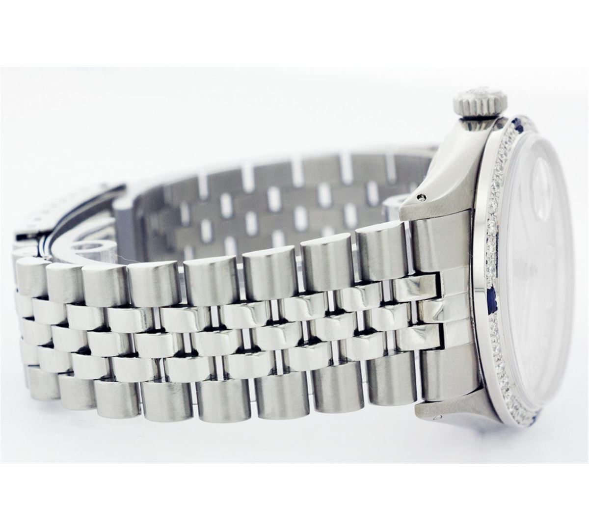One Mens Stainless Steel Rolex Datejust Polished Bright with Satin Finish, Fully Serviced & Electronically Tested, Stainless Steel Case:36mm, Stainless Steel Crown, Custom Bezel: 18K White Gold Sapphire Beadset Diamond Bezel, Diamond Count: 36 Diamonds + 4 Sapphires, Total Weight 1.00 Carat, Clarity: SI-VS, Color: G to H. Custom Crystal: Synthetic Sapphire Cyclops Lens. Movement: Automatic Winding Movement Caliber 3035. Custom Dial: Silver Diamond Dial, 10 Diamonds in Dial G To H In Color, Clarity: SI-VS. Date Window: 3 O'Clock Position Date Display, Quickset, Model: Datejust, Condition: G-6 Extra Fine. Bracelet:Stainless Steel Jubilee. Bright Polish & Satin Finish. 6.5 Inch Length, Adjustable. Standard Clasp, With Rolex Logo.