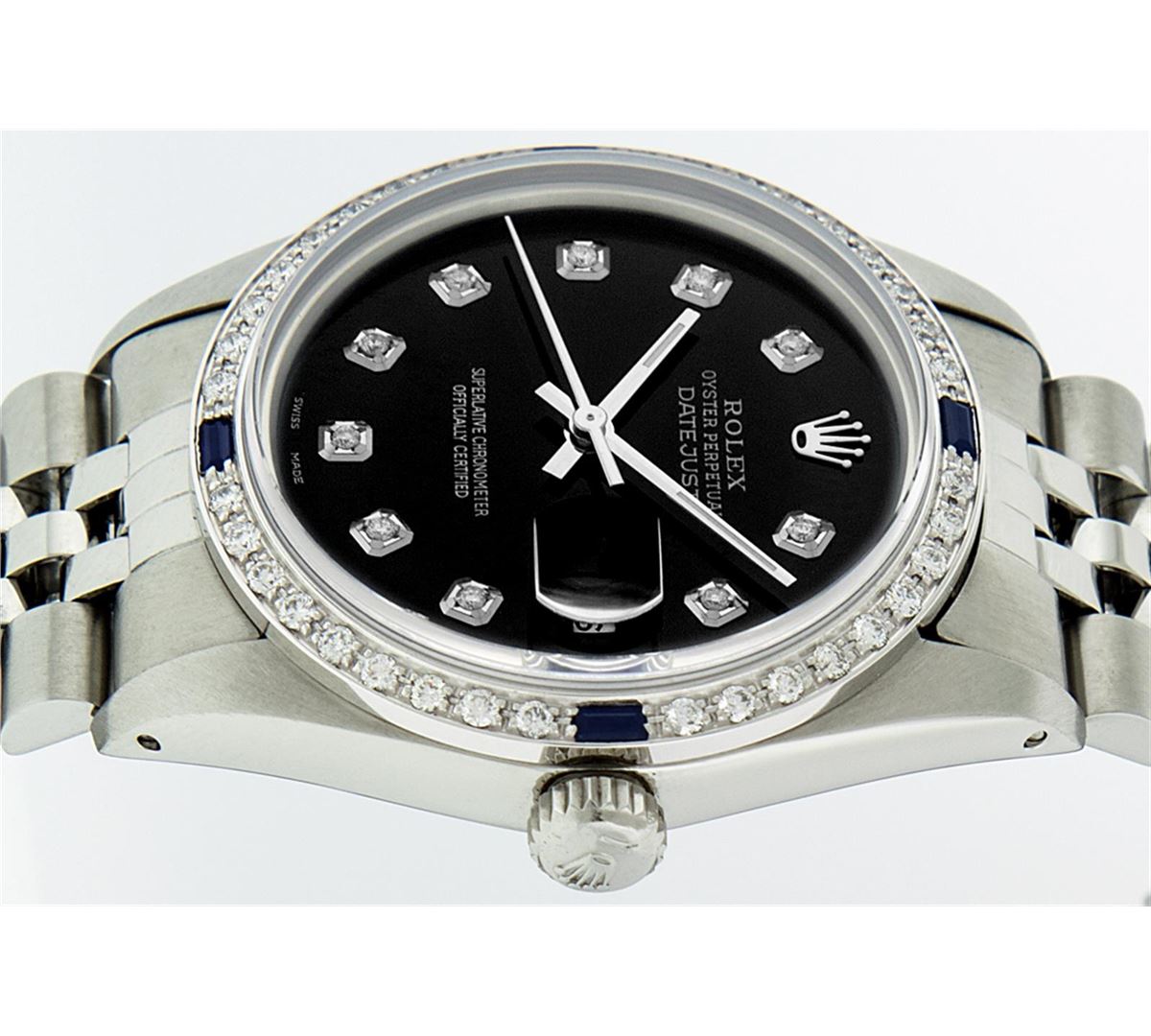 One Gents Rolex Datejust Polished, Serviced & Electronically Tested, Stainless Steel Case:36mm, Stainless Steel Crown, Custom Bezel: 18K White Gold Sapphire Beadset Diamond Bezel, Diamond + Gem Count: 36 Diamonds + 4 Sapphires. Total Weight 1.00 Carat, Clarity: SI-VS, Color: G to H. Custom Crystal: Synthetic Sapphire Cyclops Lens. Movement: Automatic Winding Movement Caliber 3035. Custom Dial: Black With Diamond Hour Markers, 10 Diamond Dial G To H In Color, Clarity: SI-VS. Date Window: 3 O'Clock Position Date Display, Quickset, Model: Datejust. Condition: G-6 Extra Fine. Bracelet: Stainless Steel Jubilee. Bright Polish & Satin Finish. 7.0 Inch Length, Adjustable. Standard Clasp, With Rolex Logo. Comes with 6 month warranty.