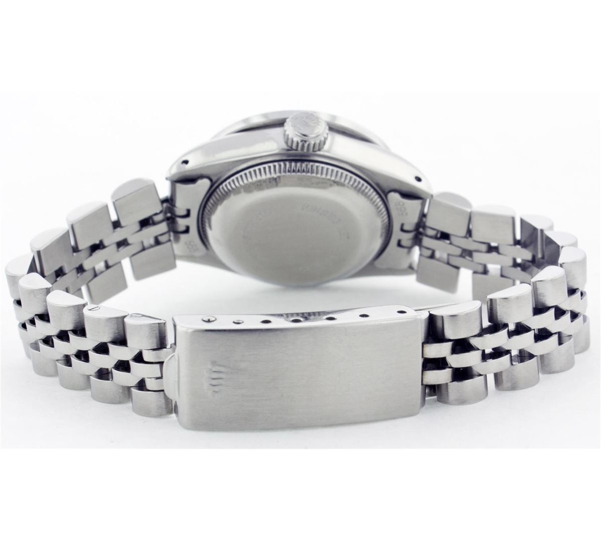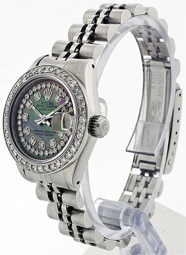 One Ladies Rolex Datejust Polished Bright with Satin Finish, Serviced & Electronically Tested, Stainless Steel Case:26mm, Stainless Steel Crown, Custom Bezel: Stainless Steel Beadset Diamond Bezel, Diamond Count: 40 Diamonds Total Weight 1.00 Carat, Clarity: SI-VS, Color: G to H. Custom Crystal: Synthetic Sapphire Cyclops Lens. Movement: Automatic Winding Movement Caliber 2030. Custom Dial: Black Mother Of Pearl With String Diamond Dial, Diamond Count: 43 Diamonds In Dial, Clarity: SI-VS, Color: G to H. Date Window: 3 O'Clock Position Date Display, Quickset, Model: 6917 Condition: G-6 Extra Fine. Bracelet: Stainless Steel Jubilee. Bright Polish & Satin Finish. 5.5 Inch Length, Adjustable. Standard Clasp, With Rolex Logo.