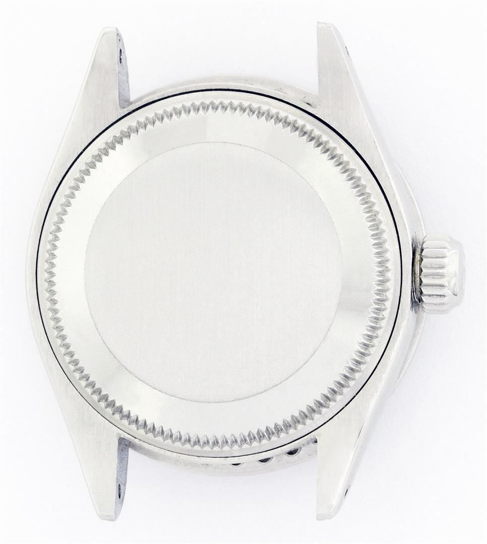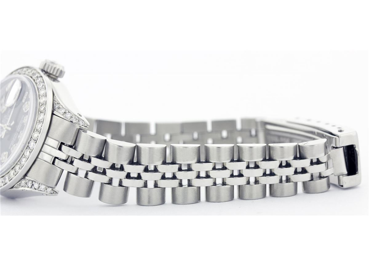 One Ladies Rolex Datejust Polished Bright with Satin Finish, Serviced & Electronically Tested, Stainless Steel Case:26mm, Stainless Steel Crown, Diamond Lugs: 16 Diamonds On Lugs, Clarity: SI-VS, Color: G to H. Custom Bezel: Stainless Steel Beadset Diamond Bezel, Diamond Count: 40 Diamonds Total Weight 1.00 Carat, Clarity: SI-VS, Color: G to H. Custom Crystal: Synthetic Sapphire Cyclops Lens. Movement: Automatic Winding Movement Caliber 2030. Original Custom Dial: Refinished Black With String Diamond Dial, 43 Diamonds in Dial G To H In Color, Clarity: SI-VS. Date Window: 3 O'Clock Position Date Display, Quickset, Model: 6917 Condition: G-6 Extra Fine. Bracelet: Stainless Steel Jubilee. Bright Polish & Satin Finish. 5.5 Inch Length, Adjustable. Standard Clasp, With Rolex Logo.