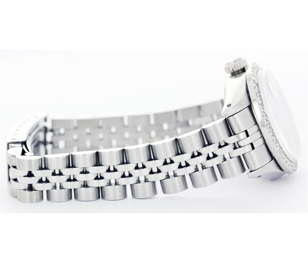One Ladies Rolex Datejust Polished Bright with Satin Finish, Serviced & Electronically Tested, Stainless Steel Case:26mm, Stainless Steel Crown, Clarity: SI-VS, Color: G to H. Custom Bezel: Stainless Steel Beadset Diamond Bezel, Diamond Count: 40 Diamonds Total Weight 1.00 Carat, Clarity: SI-VS, Color: G to H. Custom Crystal: Synthetic Sapphire Cyclops Lens. Movement: Automatic Winding Movement Caliber 2030. Original Custom Dial: Ice Blue With Diamond Dial, 10 Diamond in Dial G To H In Color, Clarity: SI-VS. Date Window: 3 O'Clock Position Date Display, Non Quickset, Model: 6917 Condition: G-6 Extra Fine. Bracelet: Stainless Steel Jubilee. Bright Polish & Satin Finish. 5.5 Inch Length, Adjustable. Standard Clasp, With Rolex Logo.