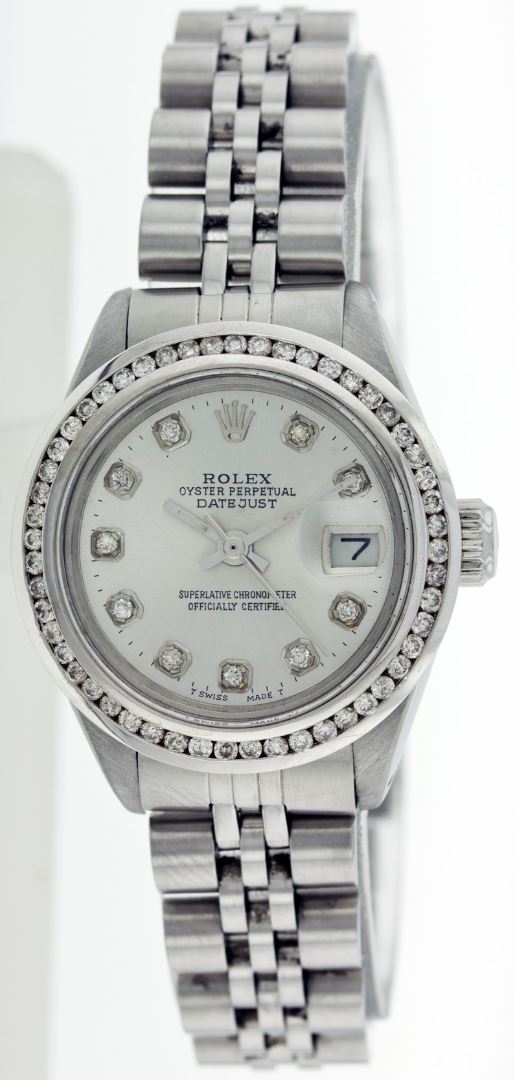 One Ladies Rolex Datejust Polished Bright with Satin Finish, Serviced & Electronically Tested, Stainless Steel Case:26mm, Stainless Steel Crown, Custom Bezel: 18K White Gold Channel Set Beadset Diamond Bezel, Diamond Count: 44 Diamonds Total Weight 1.00 Carat, Clarity: SI-VS, Color: G to H. Custom Crystal: Synthetic Sapphire Cyclops Lens. Movement: Automatic Winding Movement Caliber 2030. Custom Dial: Silver Diamond Dial, Diamond Count: 10 Diamonds In Dial, Clarity: SI-VS, Color: G to H. Date Window: 3 O'Clock Position Date Display, Non Quickset, Model: 6917 Condition: G-6 Extra Fine. Bracelet: Stainless Steel Jubilee Band. Bright Polish & Satin Finish. 5.5 Inch Length, Adjustable. Standard Clasp, With Rolex Logo.