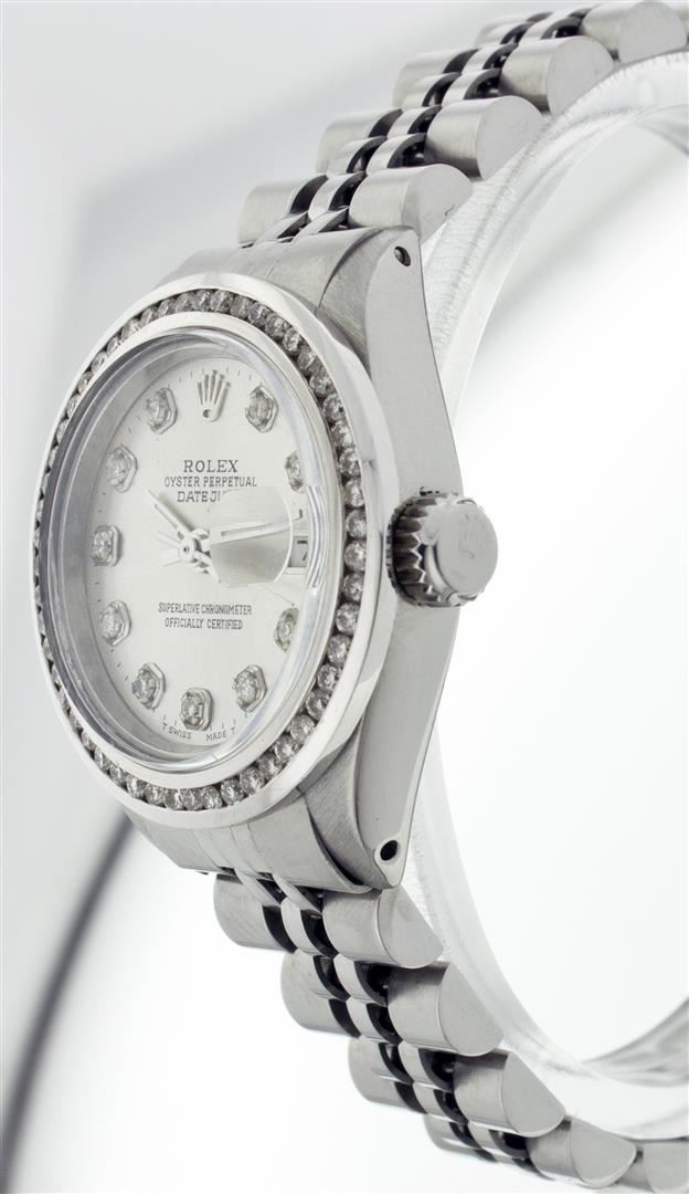 One Ladies Rolex Datejust Polished Bright with Satin Finish, Serviced & Electronically Tested, Stainless Steel Case:26mm, Stainless Steel Crown, Custom Bezel: 18K White Gold Channel Set Beadset Diamond Bezel, Diamond Count: 44 Diamonds Total Weight 1.00 Carat, Clarity: SI-VS, Color: G to H. Custom Crystal: Synthetic Sapphire Cyclops Lens. Movement: Automatic Winding Movement Caliber 2030. Custom Dial: Silver Diamond Dial, Diamond Count: 10 Diamonds In Dial, Clarity: SI-VS, Color: G to H. Date Window: 3 O'Clock Position Date Display, Non Quickset, Model: 6917 Condition: G-6 Extra Fine. Bracelet: Stainless Steel Jubilee Band. Bright Polish & Satin Finish. 5.5 Inch Length, Adjustable. Standard Clasp, With Rolex Logo.