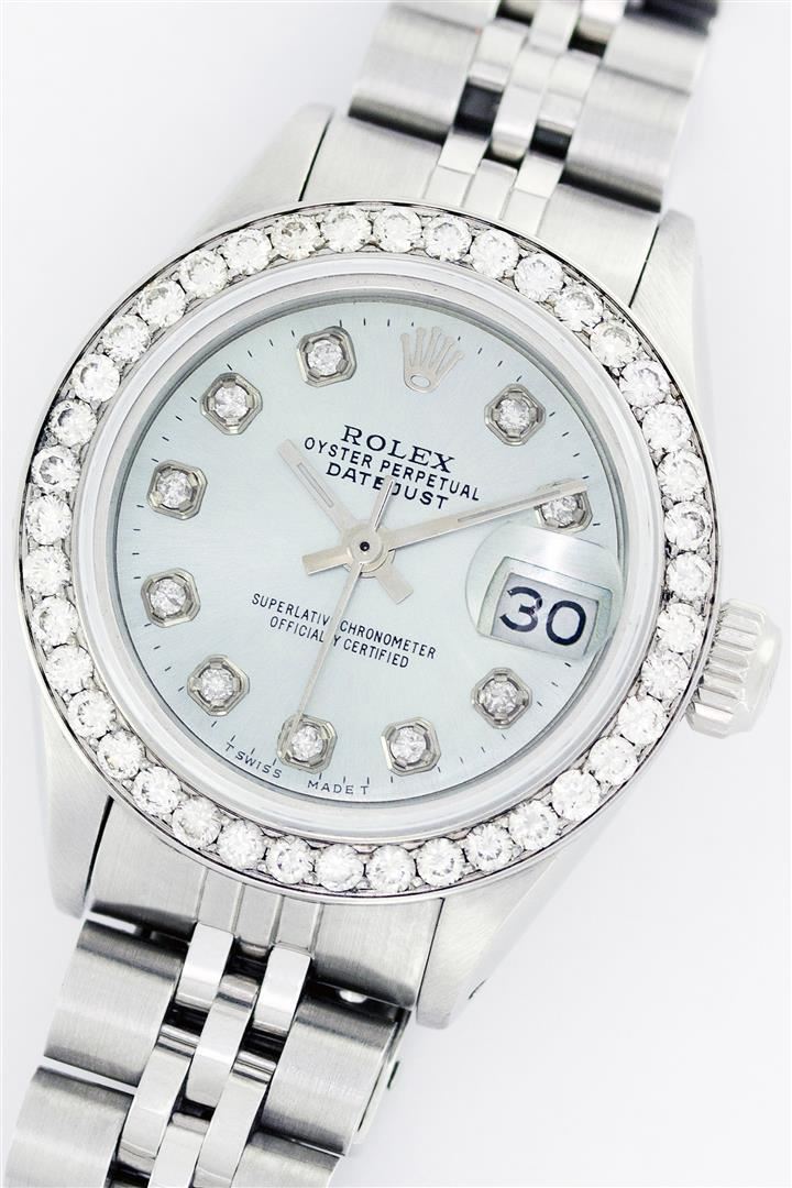 One Ladies Rolex Datejust Polished Bright with Satin Finish, Serviced & Electronically Tested, Stainless Steel Case:26mm, Stainless Steel Crown, Clarity: SI-VS, Color: G to H. Custom Bezel: Stainless Steel Beadset Diamond Bezel, Diamond Count: 40 Diamonds Total Weight 1.00 Carat, Clarity: SI-VS, Color: G to H. Custom Crystal: Synthetic Sapphire Cyclops Lens. Movement: Automatic Winding Movement Caliber 2030. Original Custom Dial: Ice Blue With Diamond Dial, 10 Diamond in Dial G To H In Color, Clarity: SI-VS. Date Window: 3 O'Clock Position Date Display, Non Quickset, Model: 6917 Condition: G-6 Extra Fine. Bracelet: Stainless Steel Jubilee. Bright Polish & Satin Finish. 5.5 Inch Length, Adjustable. Standard Clasp, With Rolex Logo.