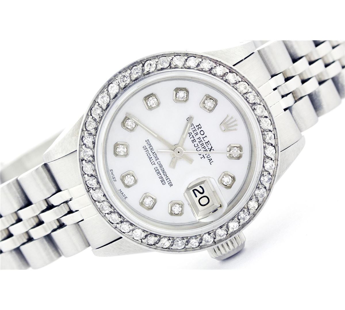 One Ladies Rolex Datejust Polished Bright with Satin Finish, Serviced & Electronically Tested, Stainless Steel Case:26mm, Stainless Steel Crown, Custom Bezel: Stainless Steel Beadset Diamond Bezel, Diamond Count: 40 Diamonds Total Weight 1.00 Carat, Clarity: SI-VS, Color: G to H. Custom Crystal: Synthetic Sapphire Cyclops Lens. Movement: Automatic Winding Movement Caliber 2030. Custom Dial: Refinished Mother Of Pearl With Diamond Hour Markers, Diamond Count: 10 Diamonds, Clarity: SI-VS, to H. Date Window: 3 O'Clock Position Date Display, Non Quickset, Model: 6917 Condition: G-6 Extra Fine. Bracelet: Stainless Steel Jubilee. Bright Polish & Satin Finish. 5.5 Inch Length, Adjustable. Standard Clasp, With Rolex Logo.